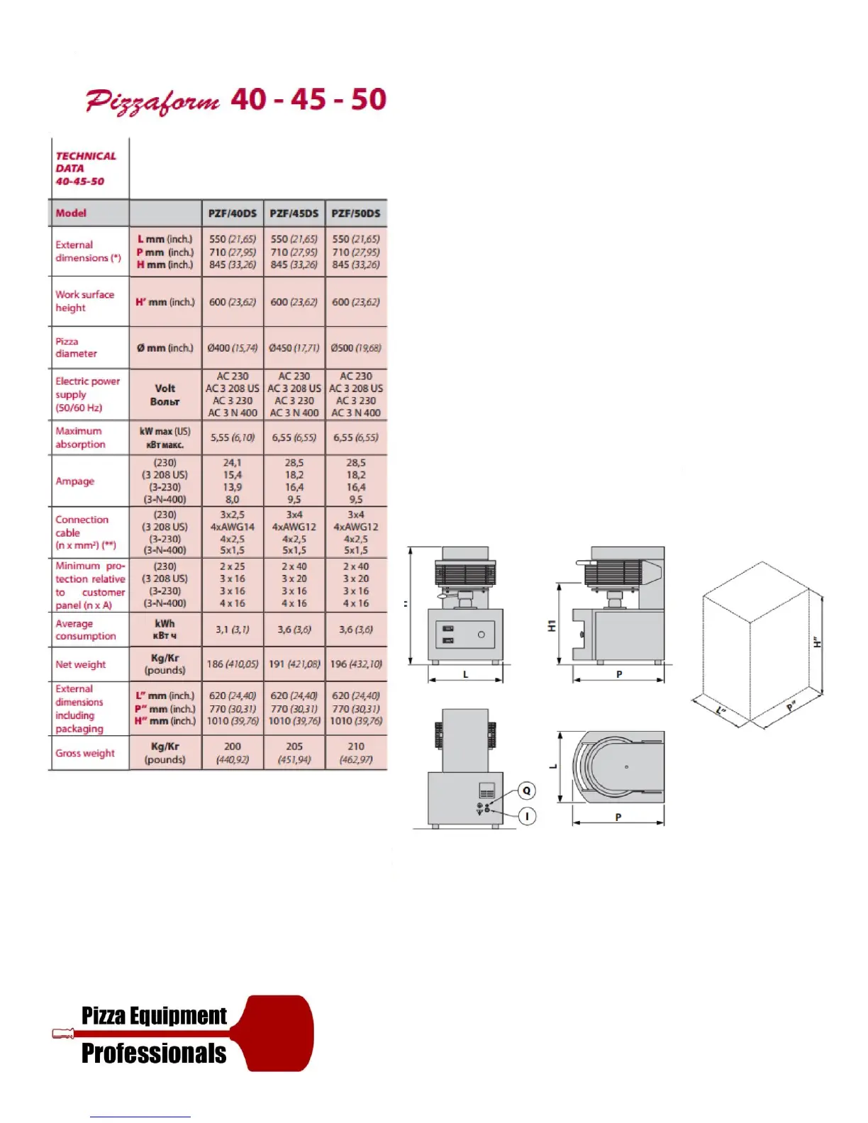 L: width P: depth H: height