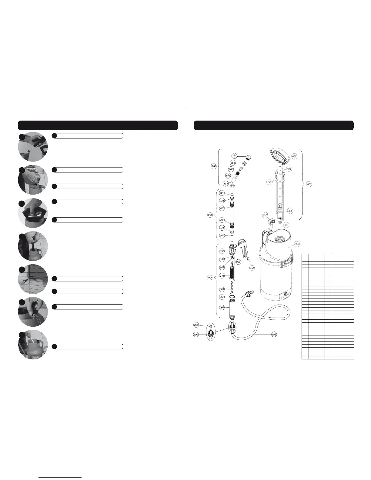 filling with water, pressurising and doing a test spray. Remove centre handle/piston (921) from the sprayer
