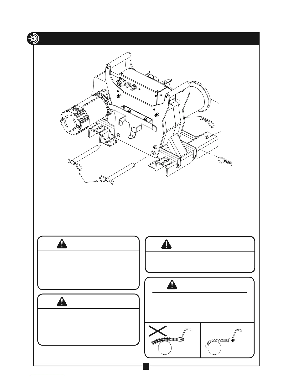 Secure the puller mount pins with spring clips. The puller MUST be mounted