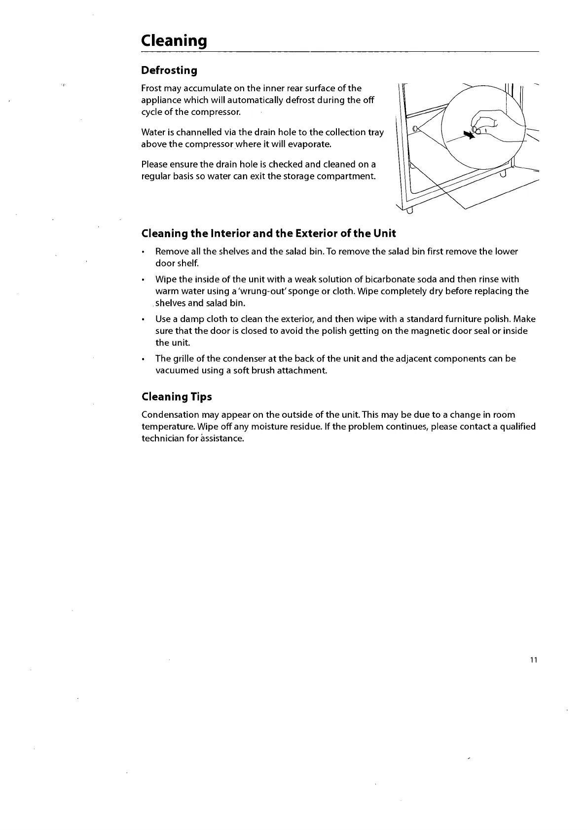 Currys Essentials CUL50W12 - Cleaning; Defrosting; Cleaning the Interior and the Exterior of the Unit; Cleaning Tips