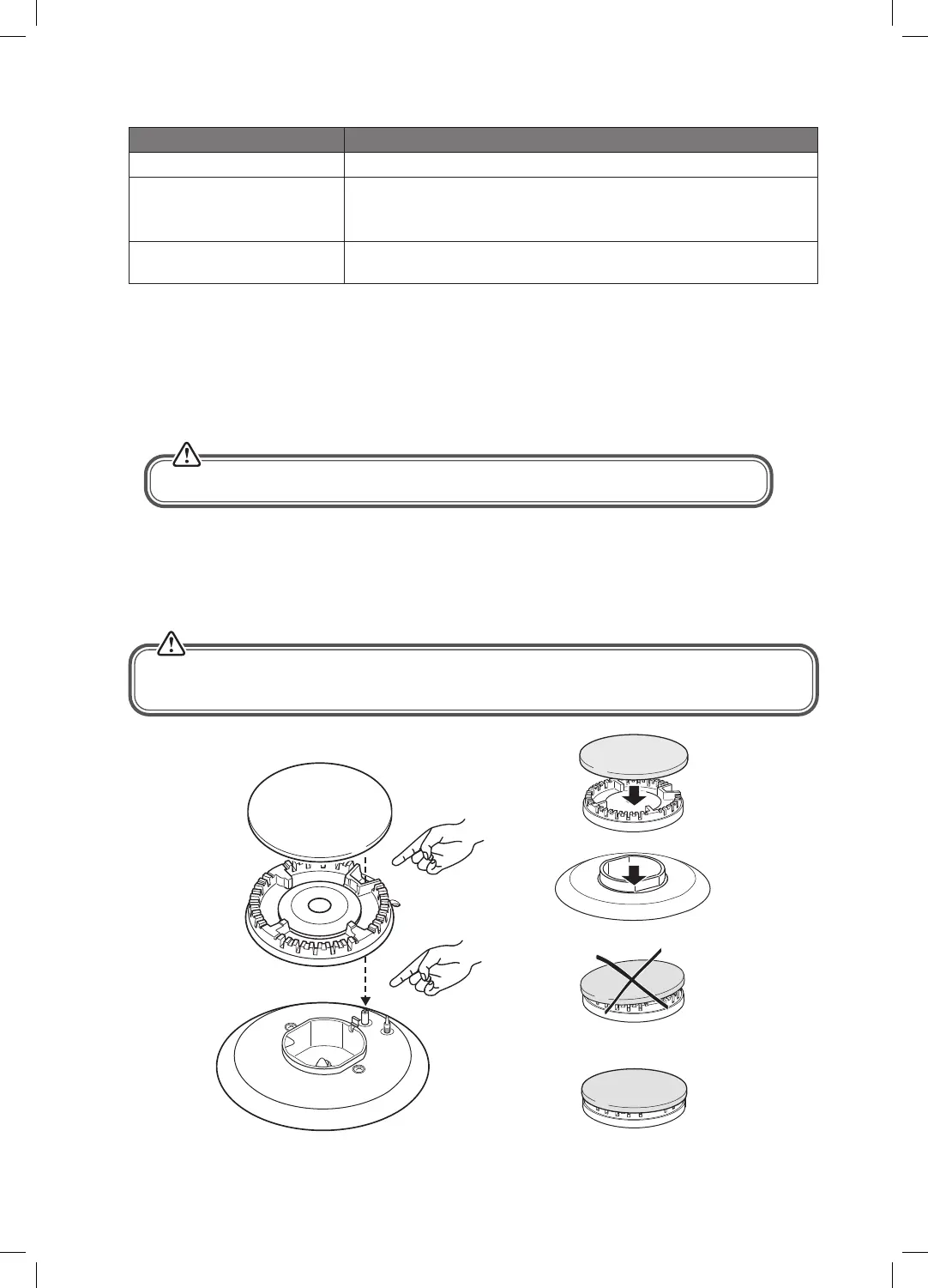 • It is very important to check that the burner ring and burner caps have been correctly positioned. Failure to do