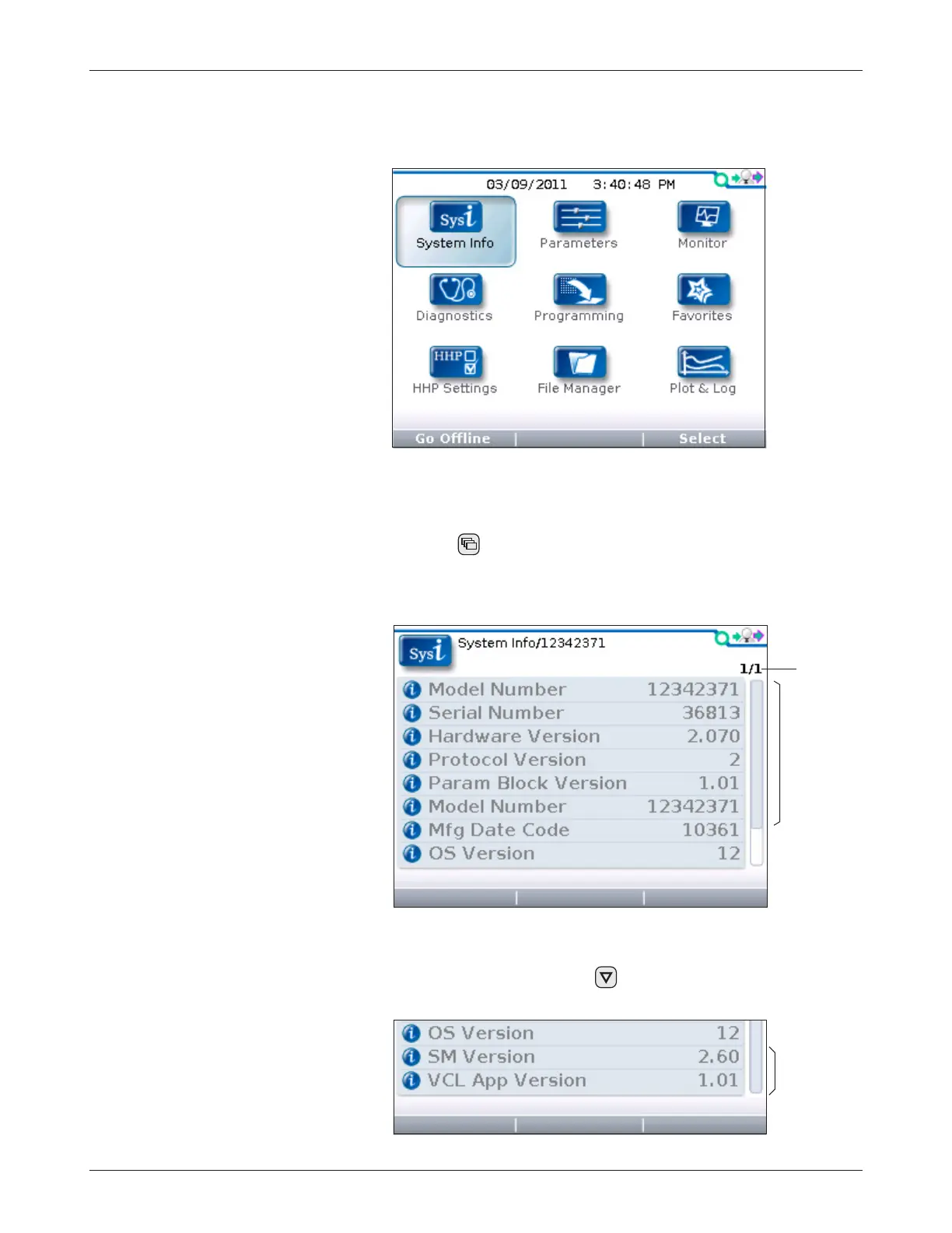 In the Main Menu, highlight the System Info icon and press the “Select” softkey