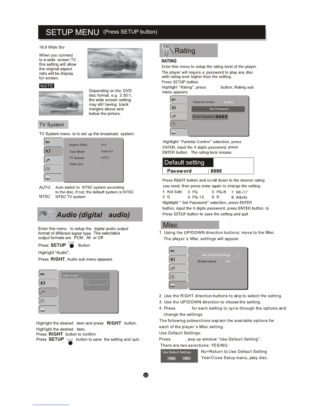 Curtis DVD1041 - SETUP MENU; TV System Setting; Rating and Password