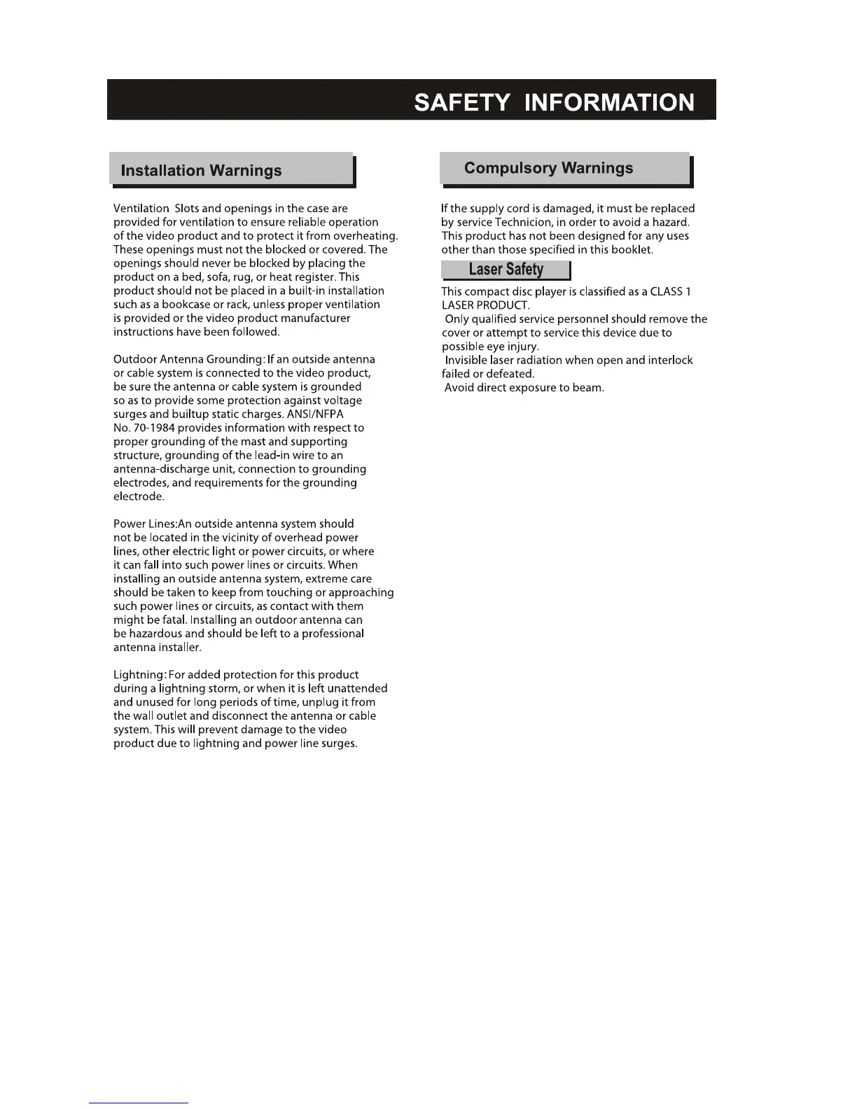 Curtis DVD1041 - SAFETY INFORMATION; Installation Warnings; Compulsory Warnings; Laser Safety