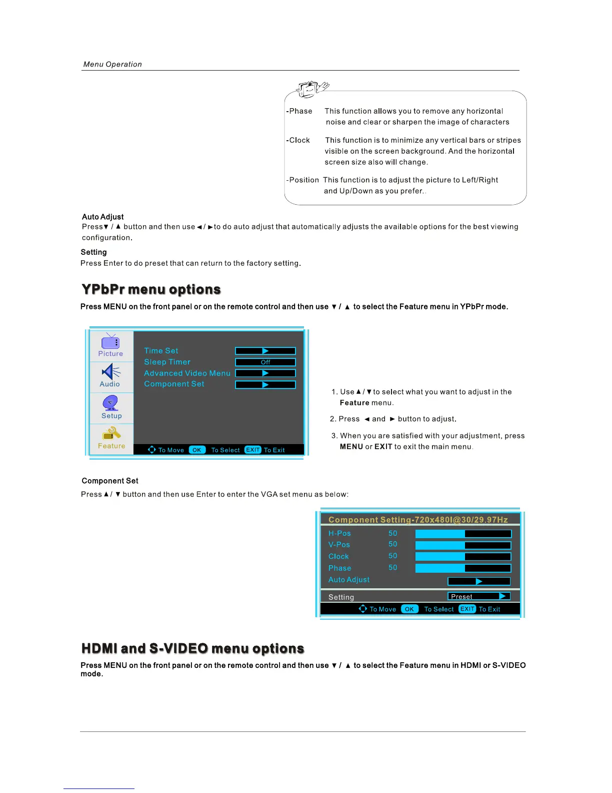Note: “Clock” and “Auto Adjust” can be workable in PC mode only.