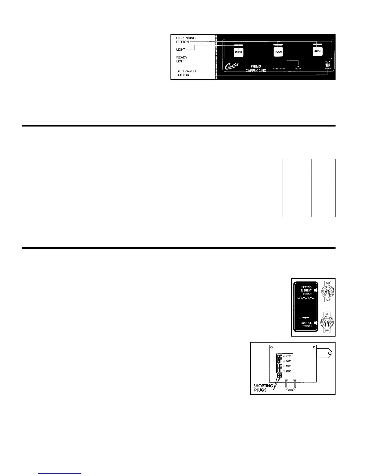 The heating element in the heating tank may be turned off in the Primo Cappuccino to allow the operator to use the unit for cold drinks. Located