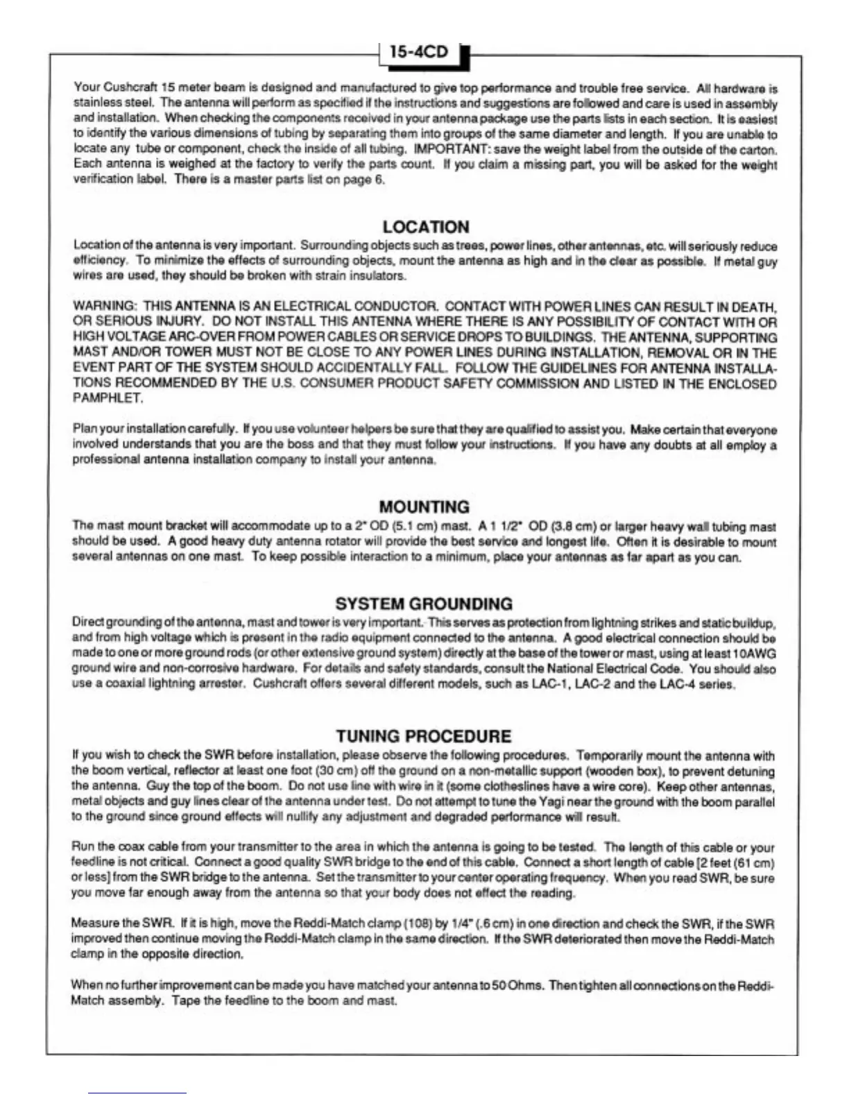 CUSHCRAFT 15-4CD Skywalker - Antenna Setup and Safety; Location and Safety Precautions; Mounting Considerations; Tuning Procedure