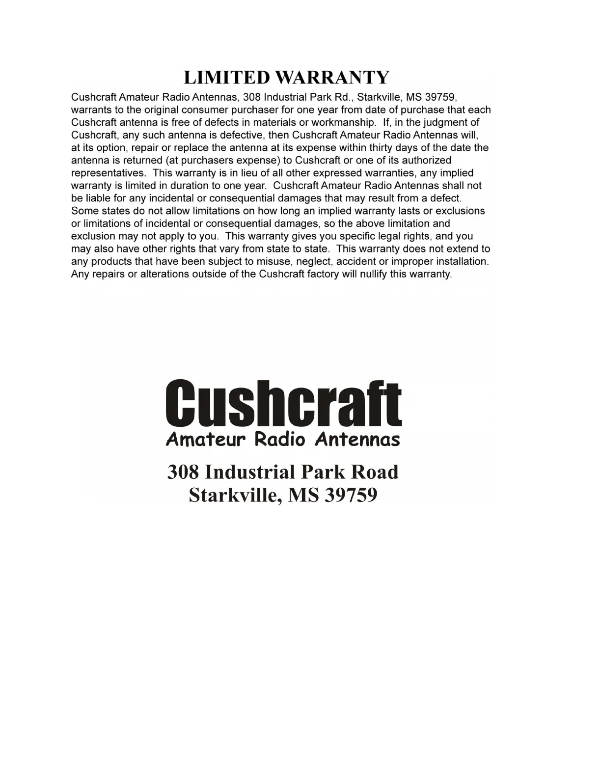 CUSHCRAFT HV-4E - Limited Warranty