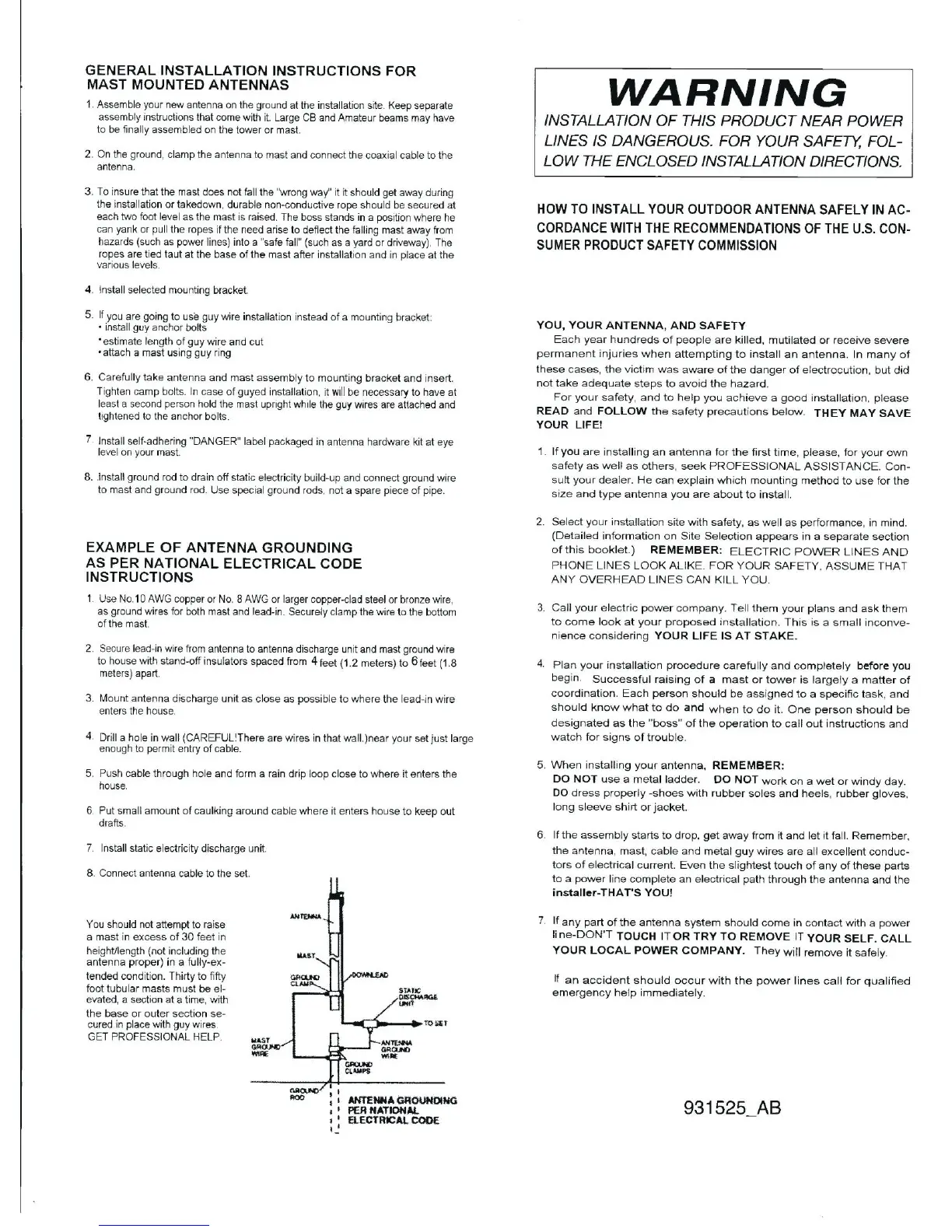 CUSHCRAFT LFA-6M4EL - General Installation Instructions for Mast Mounted Antennas; Warning; Example of Antenna Grounding as per National Electrical Code