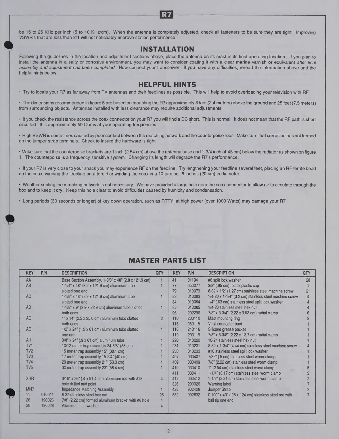 CUSHCRAFT R7 - Installation and Tuning; INSTALLATION; HELPFUL HINTS