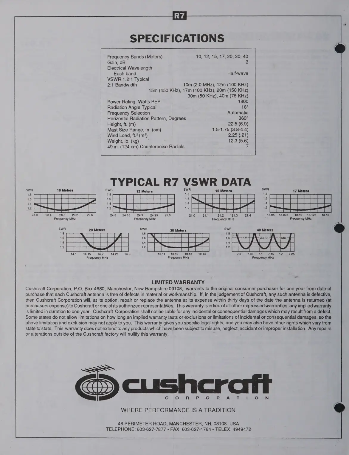 CUSHCRAFT R7 - Specifications and Warranty Information; SPECIFICATIONS; TYPICAL R7 VSWR DATA; LIMITED WARRANTY