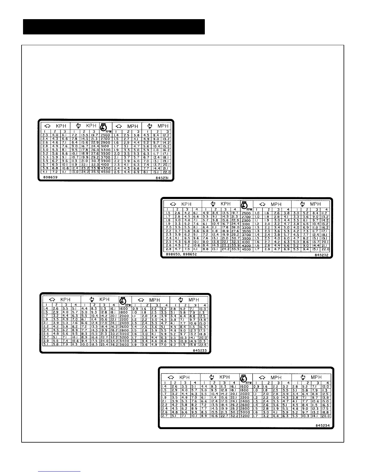 The following decal/charts show the vehicle’s ground speed in relation to the P.T.O.’s rpm. Select the proper