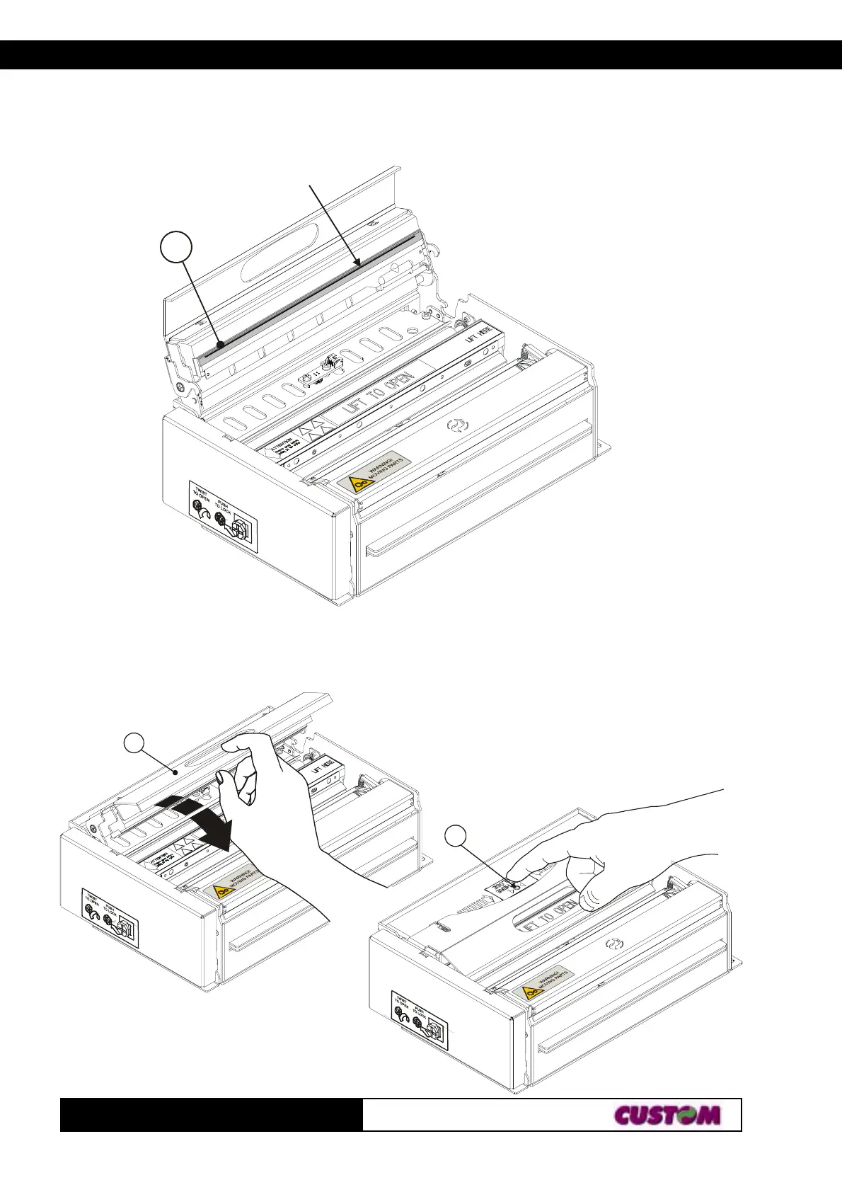 3) Lower the cover (1) to close and pressing (2) in the exact point indicated from the label