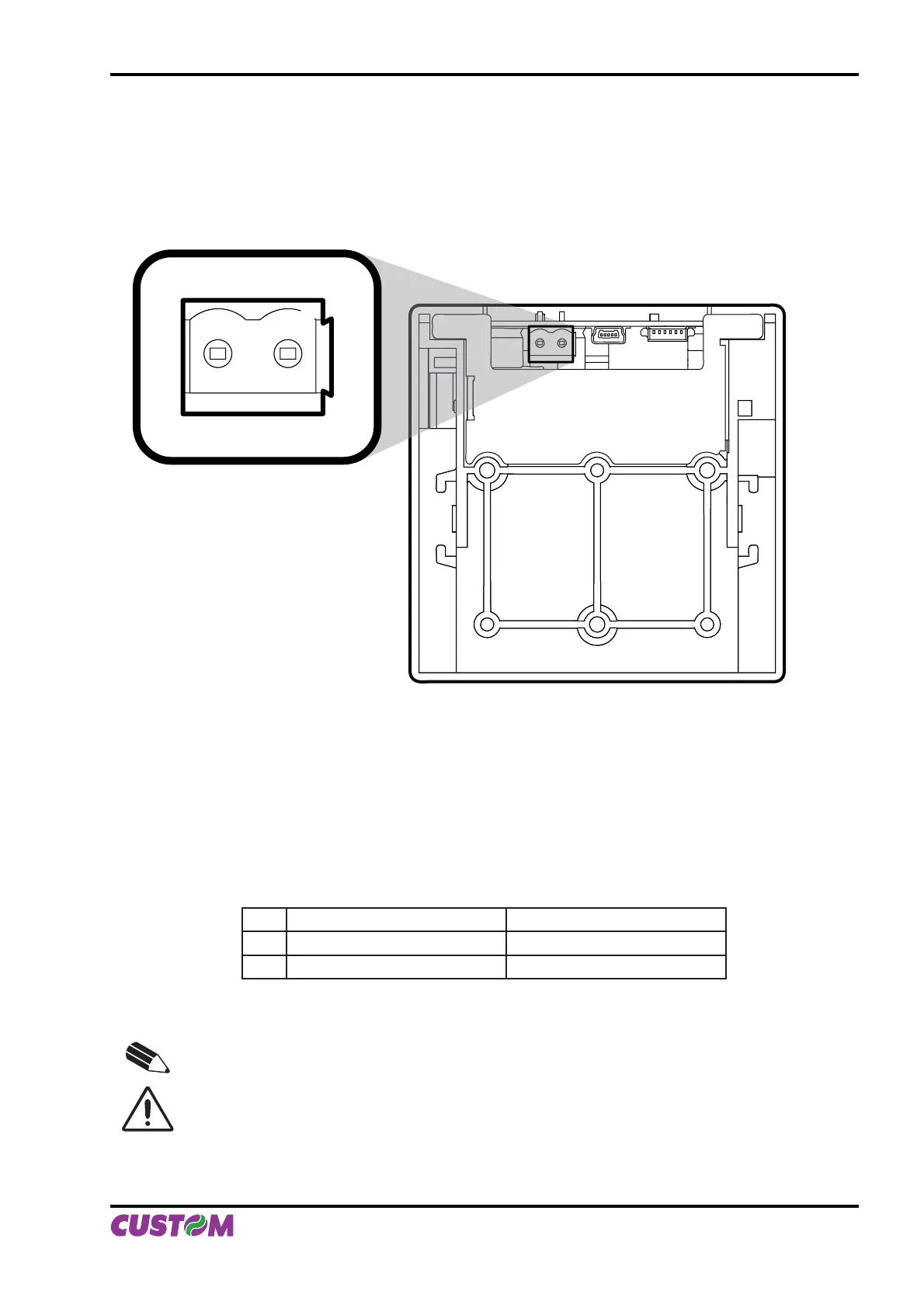 The printer is equipped with a 2 pin male connector terminal block (90°) for the power supply. The signals on