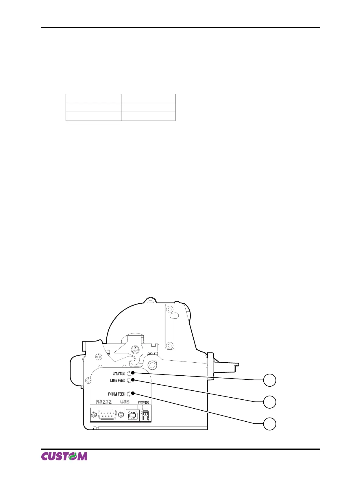 Located on the keypad are the following keys: FORM FEED (1), LINE FEED (2) and status LED (3).