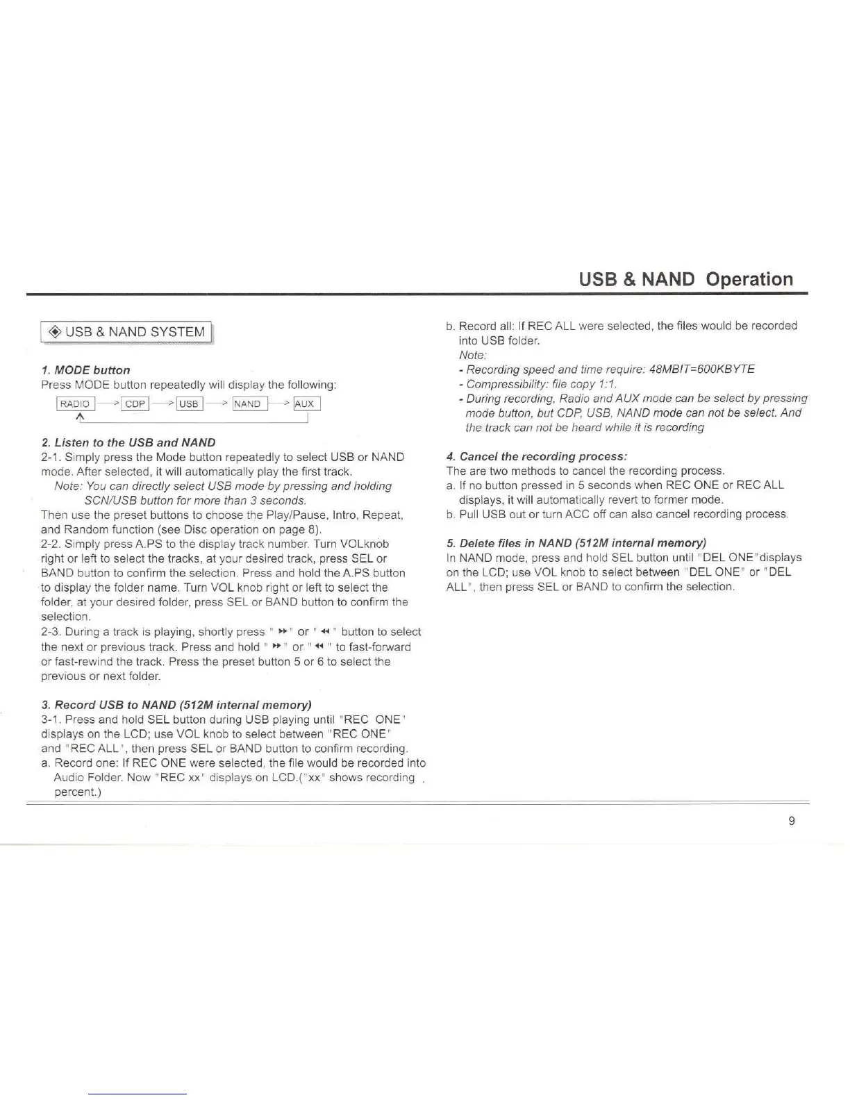 Custom Radio CSS-5900E - USB & NAND Operation; Listening to USB and NAND; Recording USB to NAND; Deleting Files in NAND