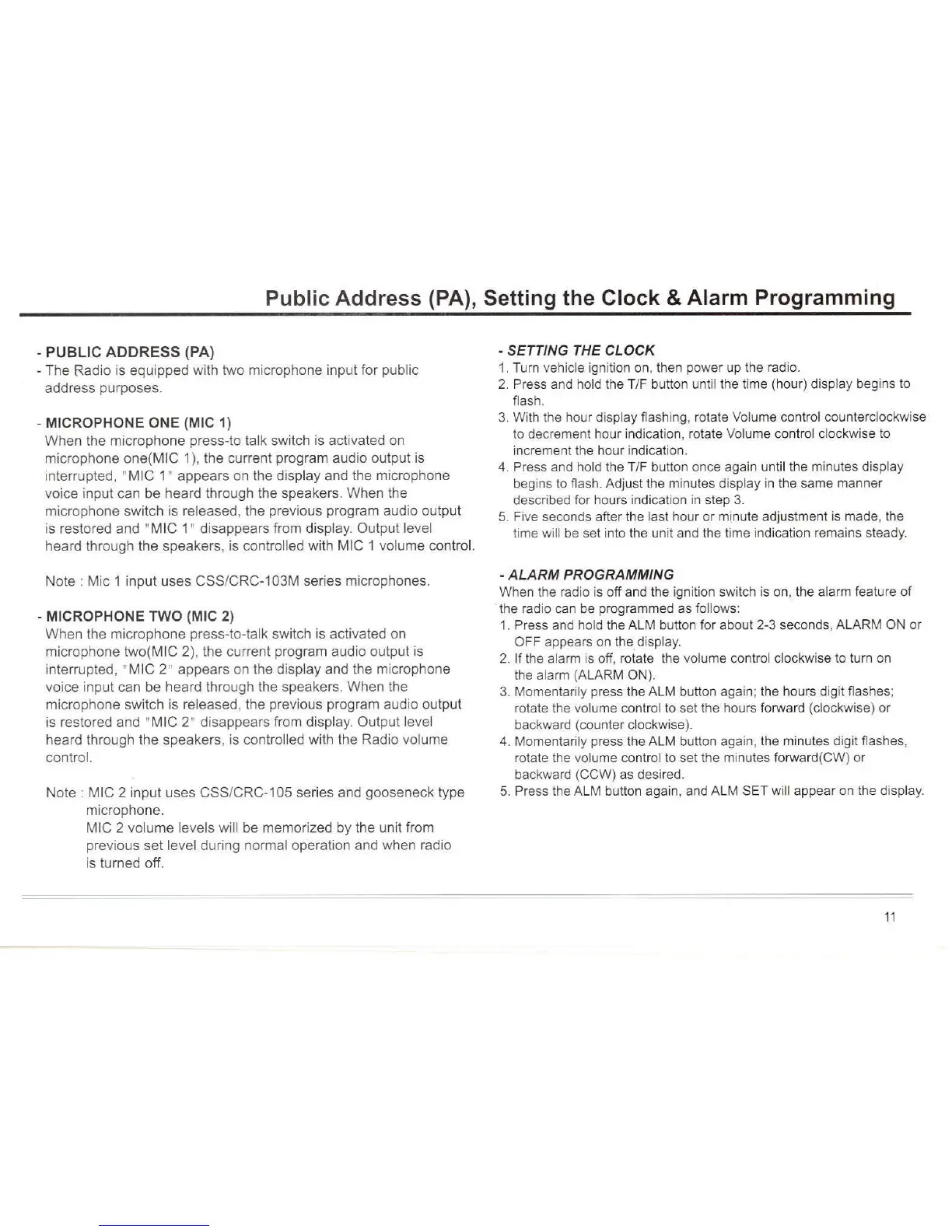 Custom Radio CSS-5900E - Public Address (PA), Clock & Alarm Programming; Public Address (PA) System; Microphone One (MIC 1); Microphone Two (MIC 2)