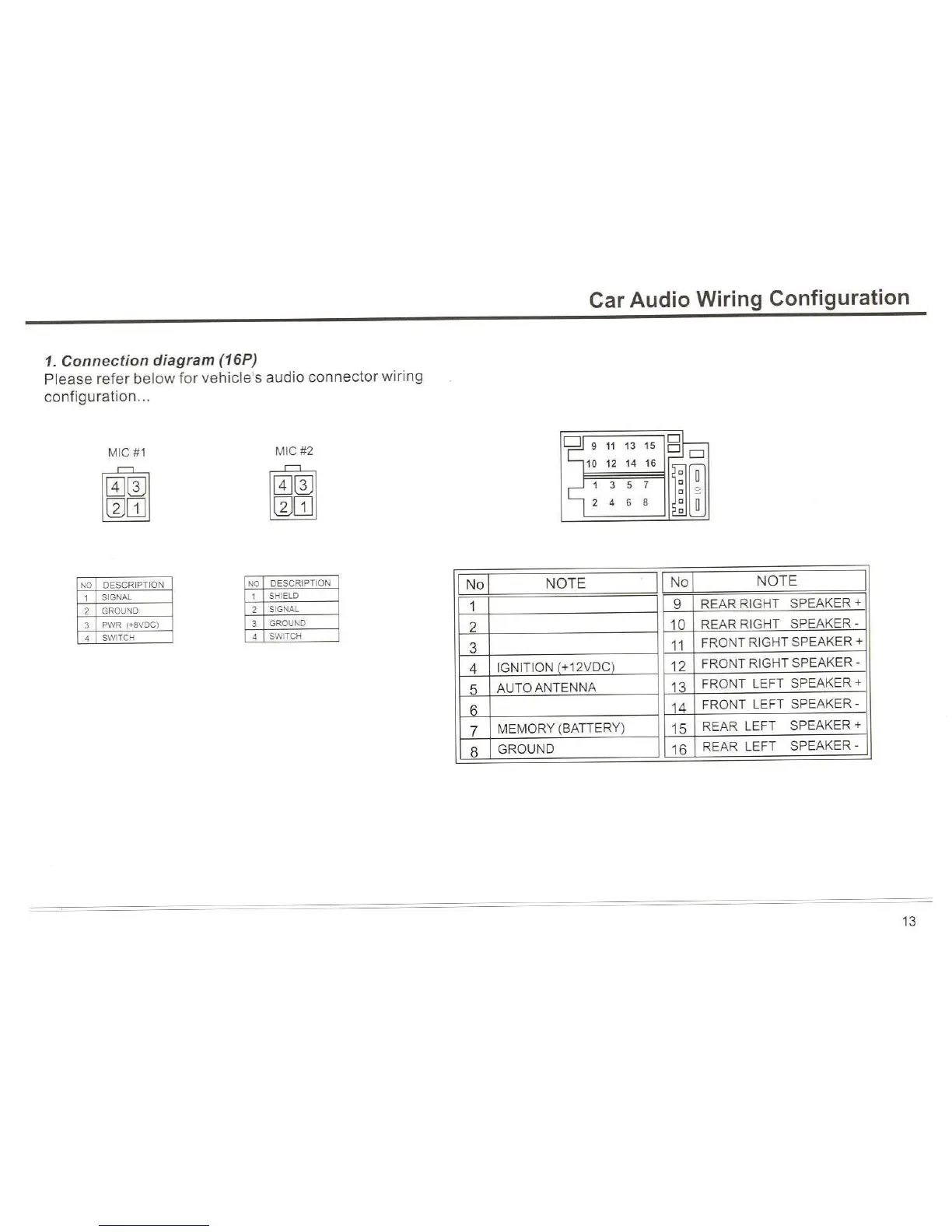 Custom Radio CSS-5900E - Car Audio Wiring Configuration; Connection Diagram (16 P); Microphone Wiring Details