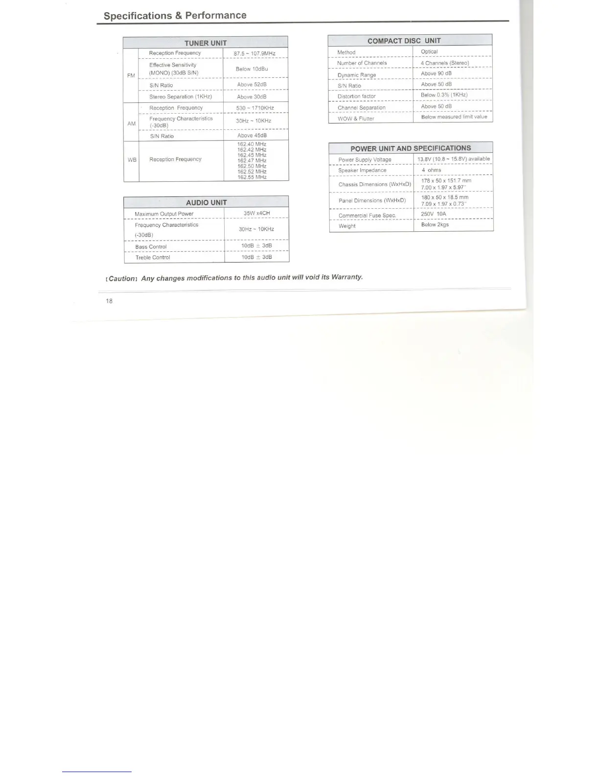 Custom Radio CSS-5900E - Specifications & Performance; Tuner Unit Specifications; Compact Disc Unit Specifications; Power Unit and Audio Specifications