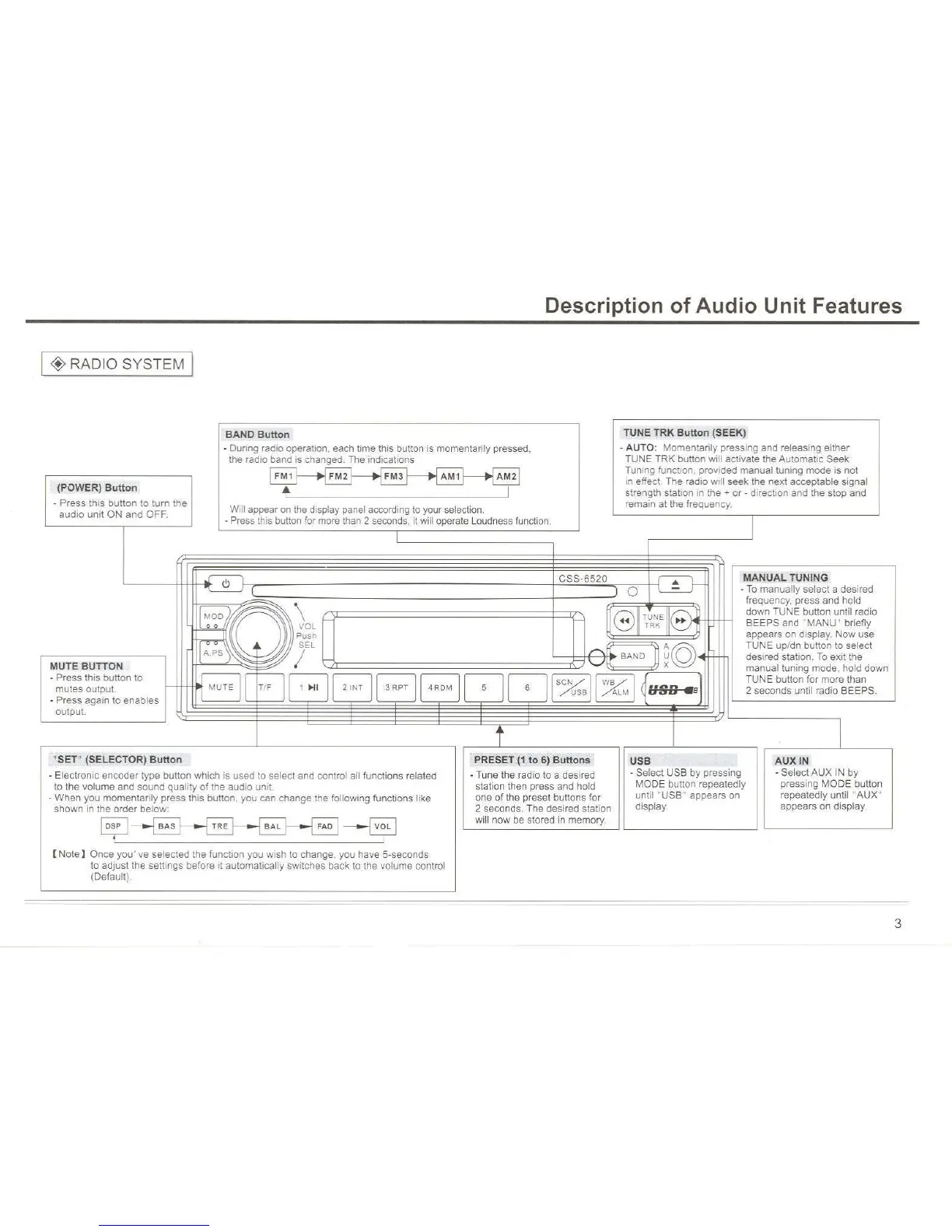 Custom Radio CSS-5900E - Audio Unit Feature Descriptions - Part 1; Tune;Seek Button Operation; Manual Tuning Mode; Set (Selector) Button