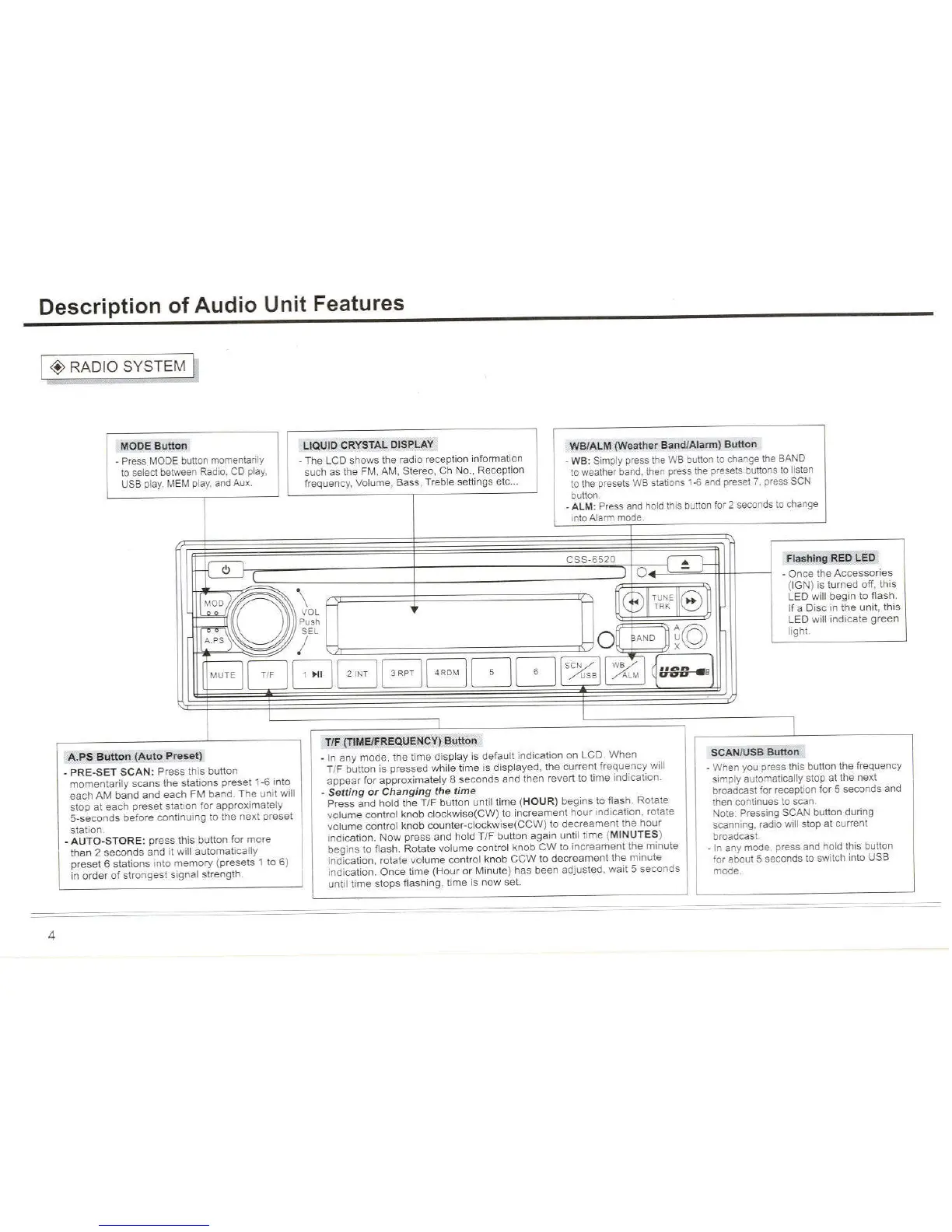 Custom Radio CSS-5900E - Audio Unit Feature Descriptions - Part 2; Weather Band;Alarm (WB;ALM) Button; Auto Preset (A.PS) Button; Time;Frequency (T;F) Button