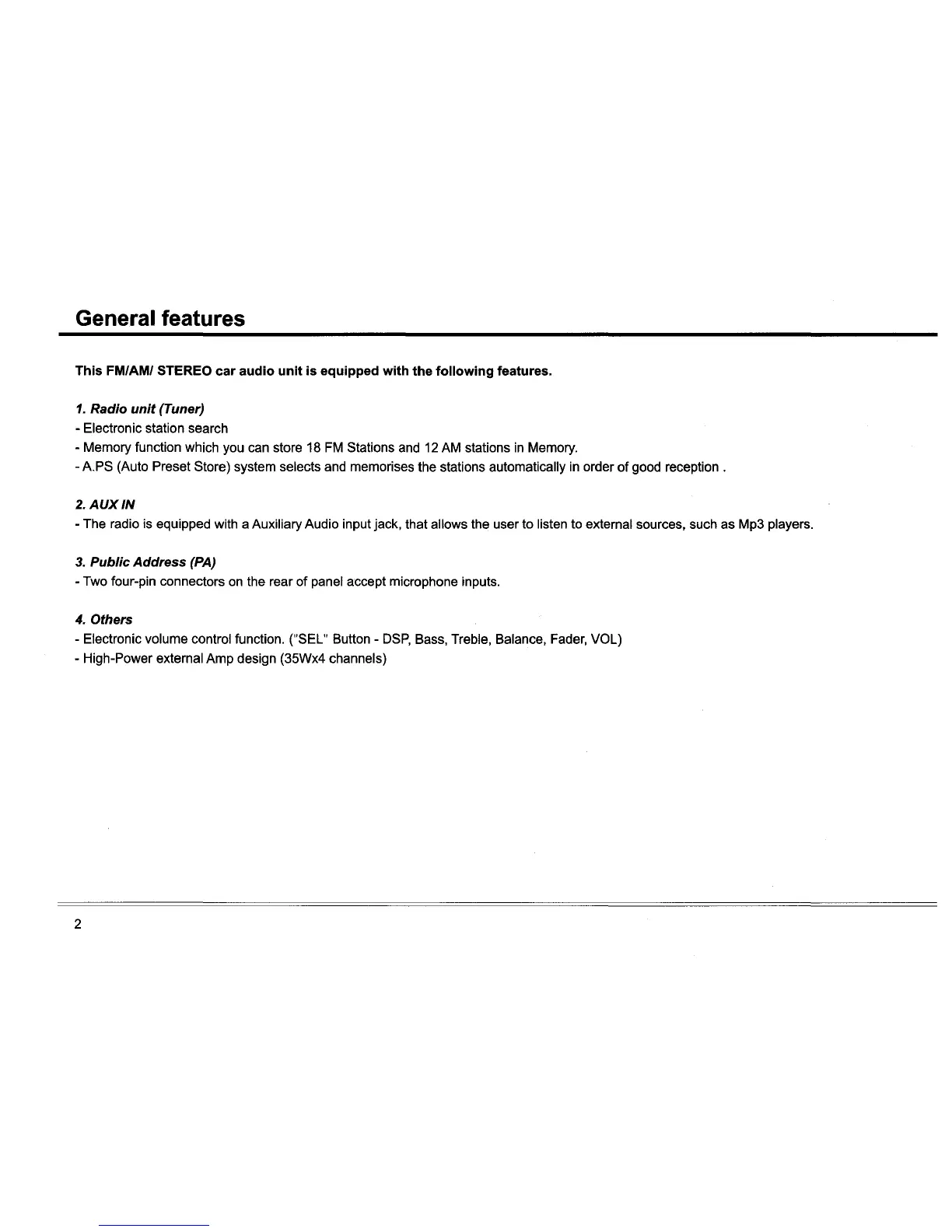 Custom Radio CSS-6000 - General Features; Radio Unit and AUX IN; Public Address (PA) and Other Features