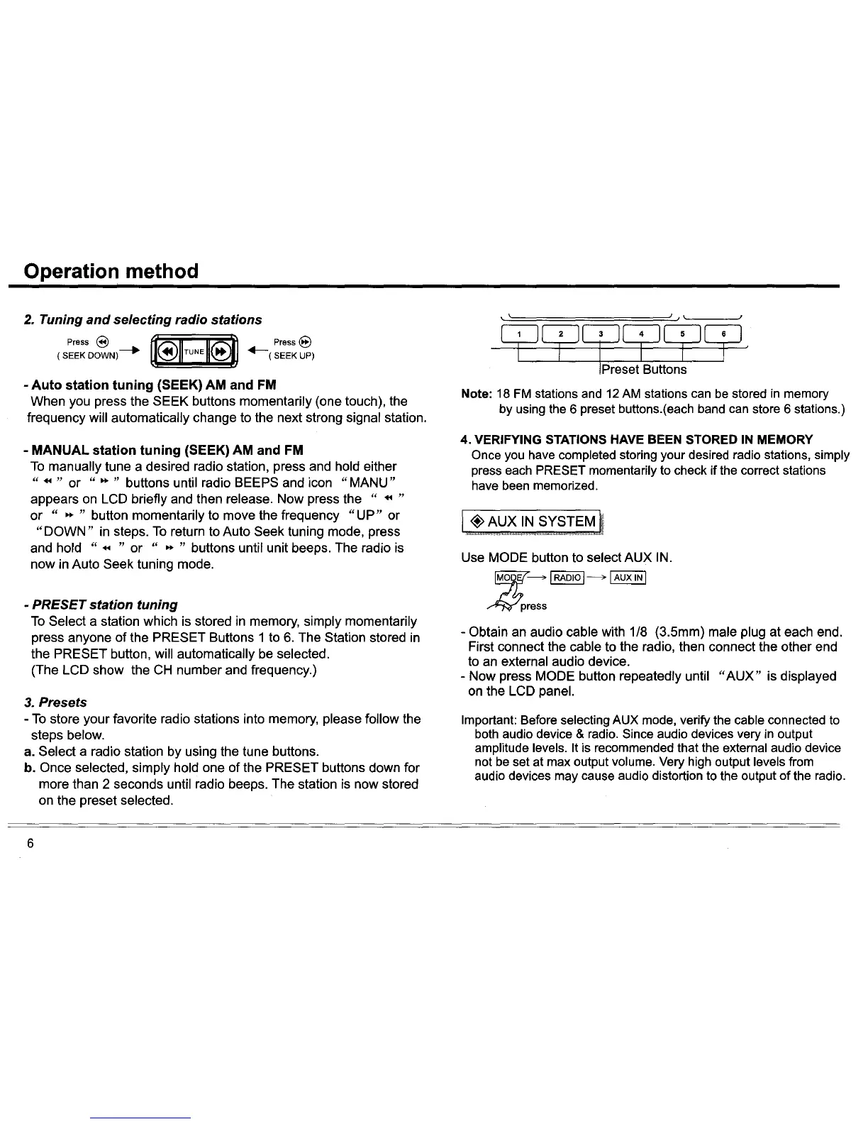 Custom Radio CSS-6000 - Operation Method: Tuning and Presets; Station Tuning and Manual Tuning; Storing and Selecting Preset Stations; AUX IN System Connection