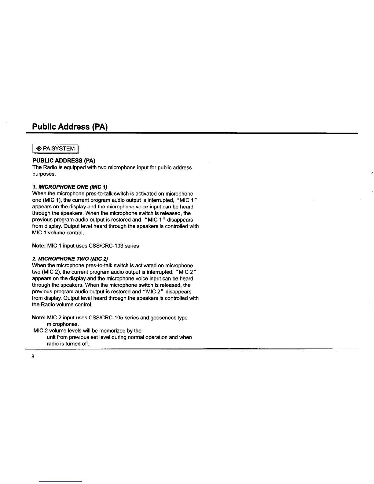 Custom Radio CSS-6000 - Public Address (PA) System Operation; Microphone One (MIC 1) Usage; Microphone Two (MIC 2) Usage
