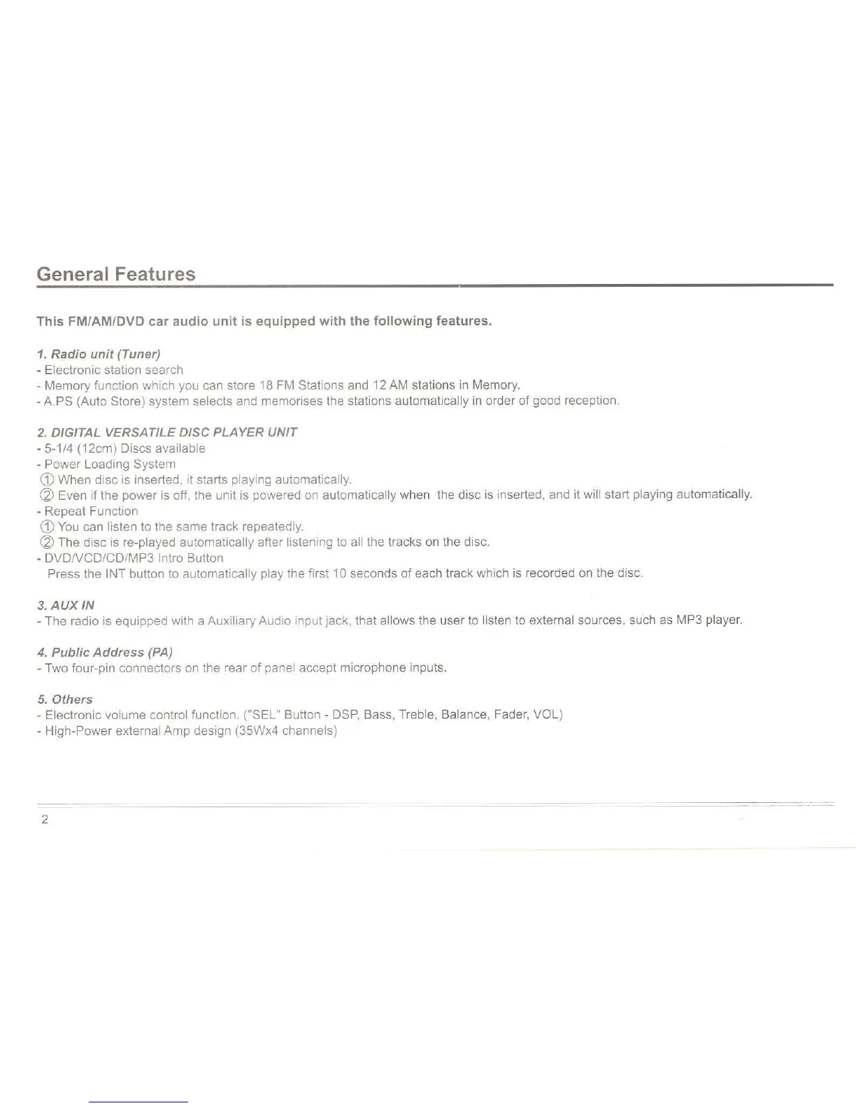 Custom Radio CSS-6400 - General Features; Radio Unit; Digital Versatile Disc Player Unit; AUX in
