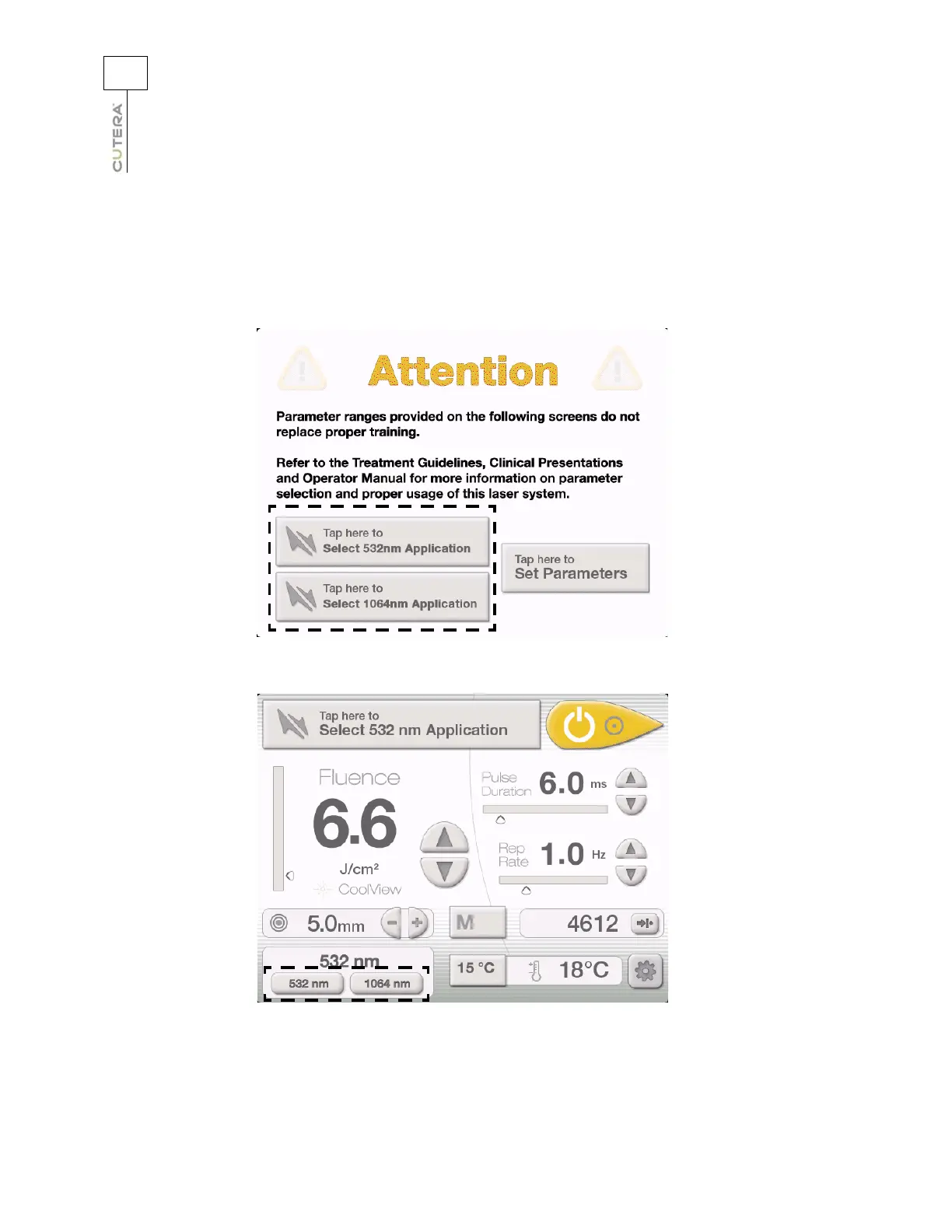 1064nm Application” button. To select the wavelength from the CoolView Treatment Screen, press the
