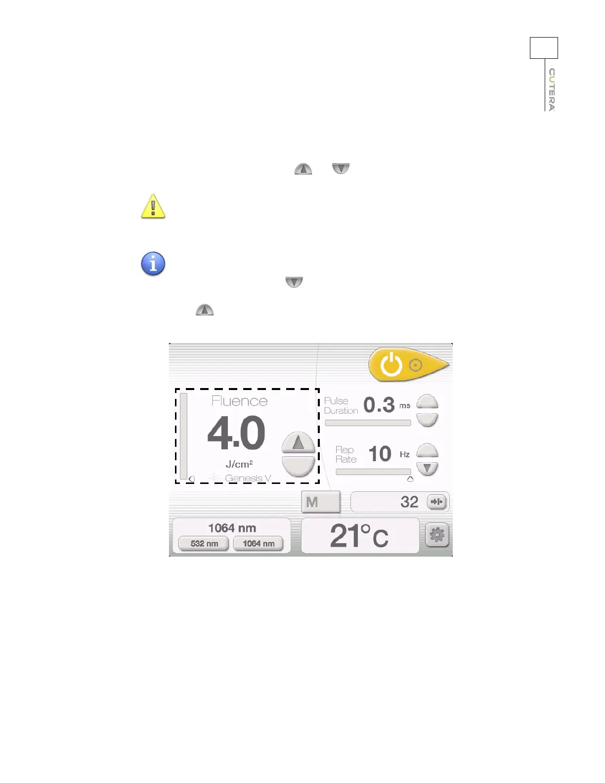 Select the desired fluence by pressing the and buttons next to the Fluence display.