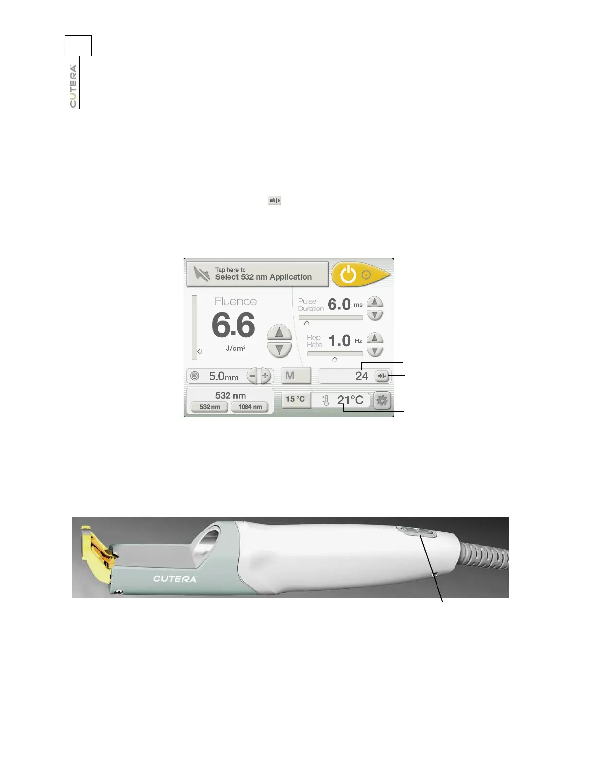 • A temperature display shows the actual temperature of the CoolView handpiece sapphire