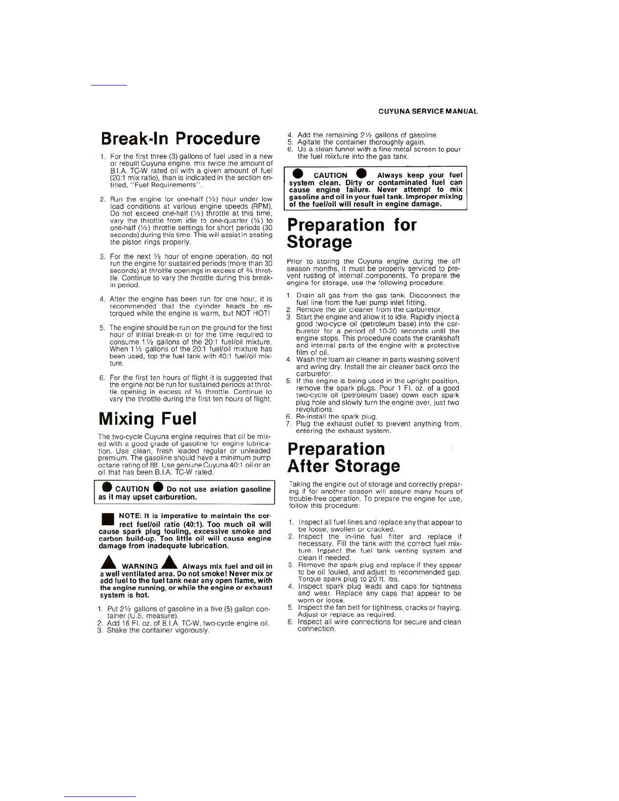 Cuyuna 215 - Break-In Procedure; Preparation for Storage; Mixing Fuel; Preparation after Storage