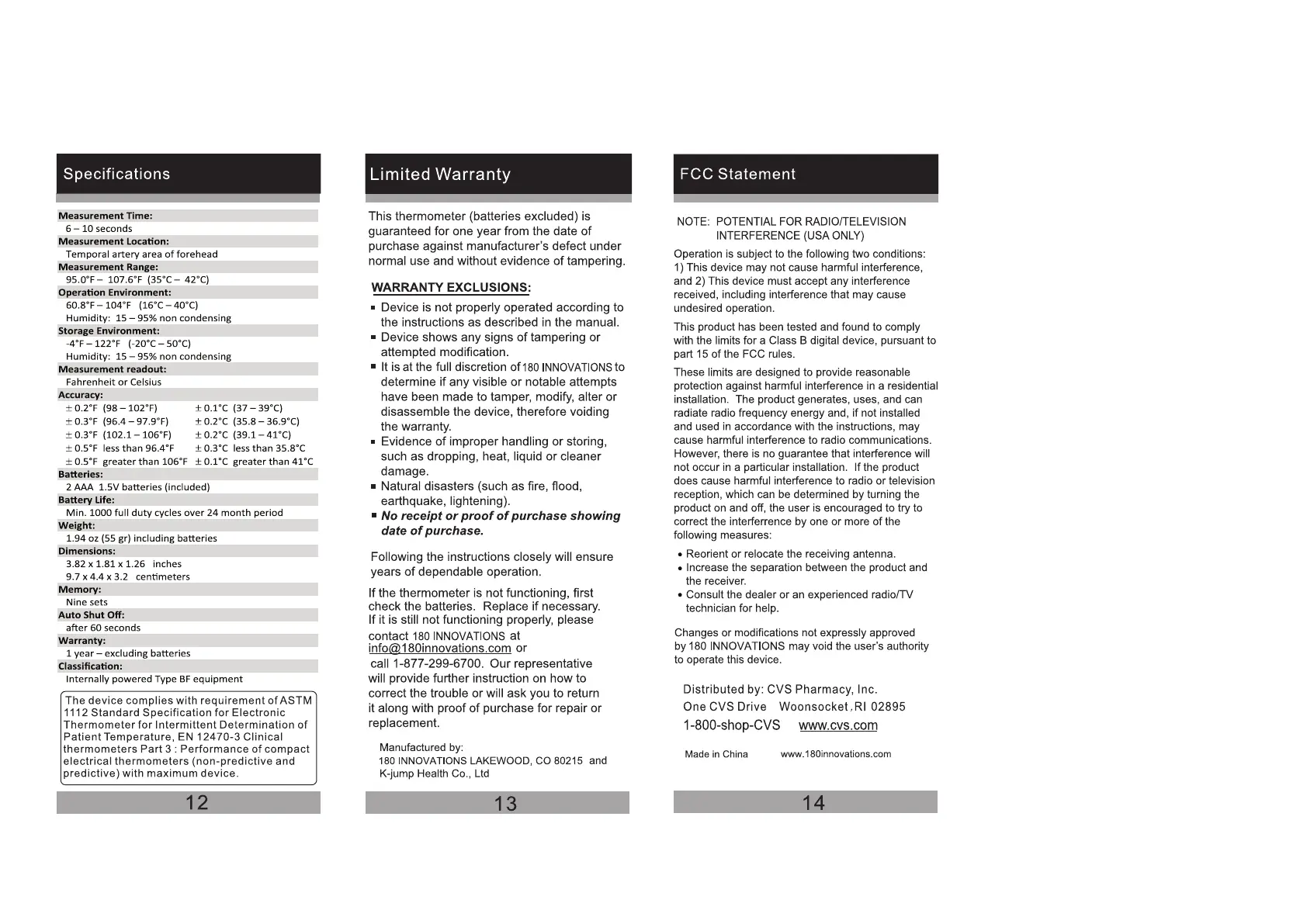 CVS KD-2220 - Specifications; Measurement Parameters; Accuracy Standards; Device Power and Battery