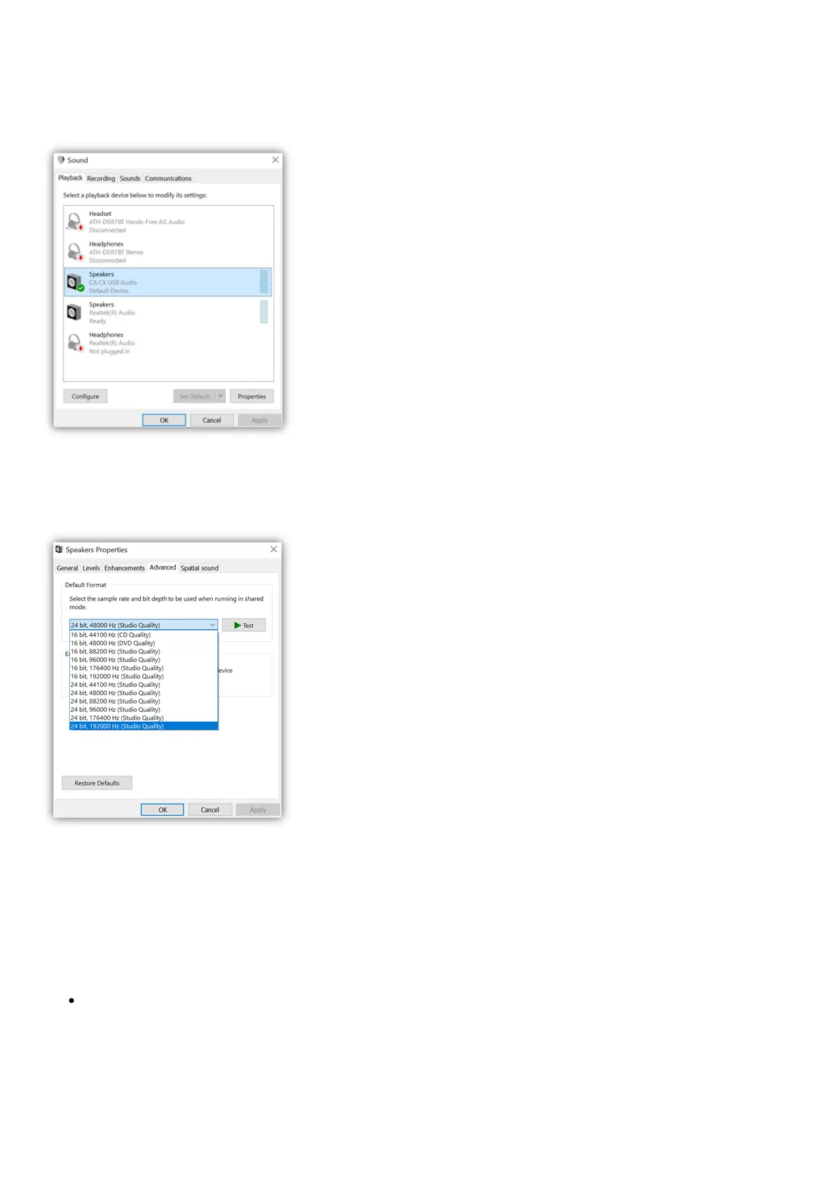 7. Within Speaker Properties, navigate to the Advanced tab. Select the desired bit depth and sample rate preference. Once selected, select Apply, then