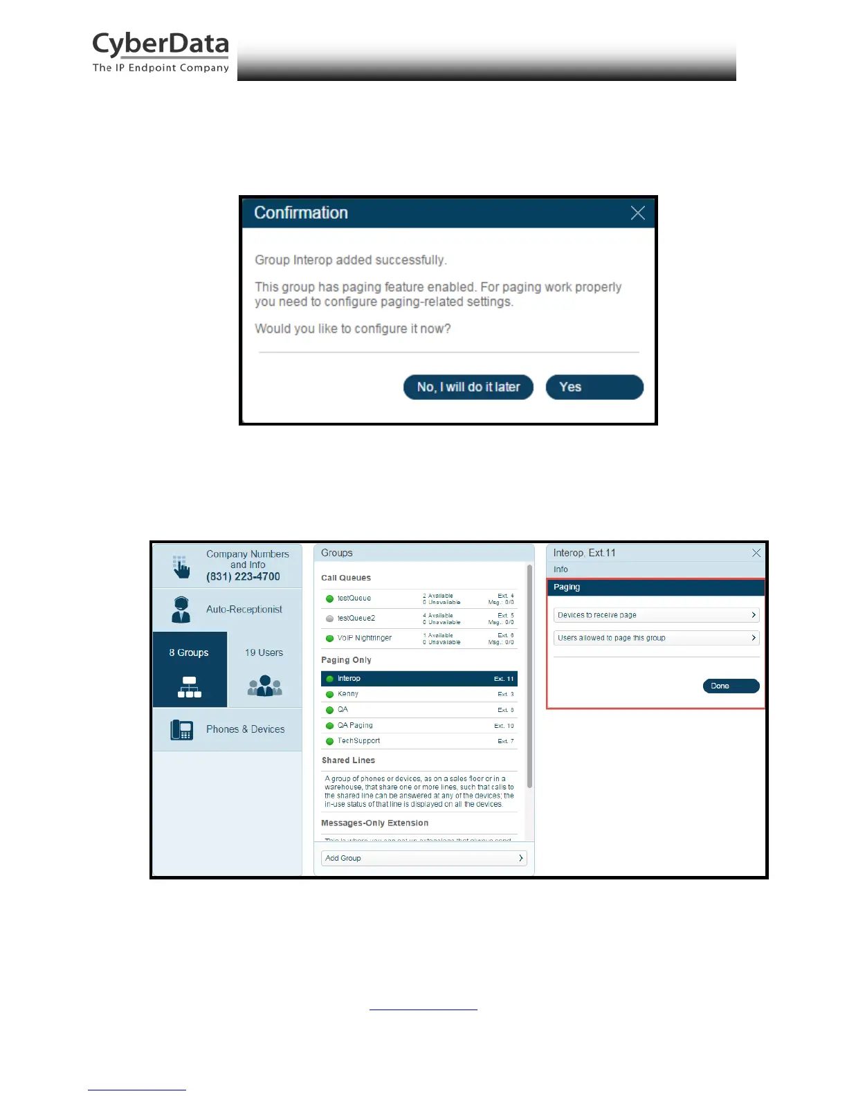 8. A confirmation screen will confirm the paging group has been created. Select Yes to
