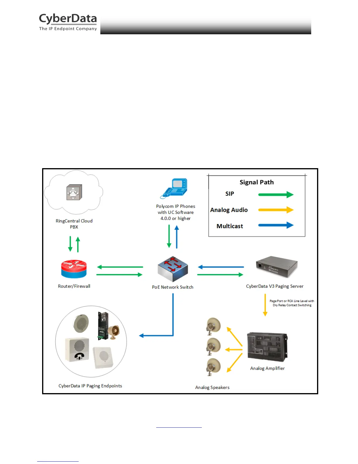 The V3 Paging Server sends multicast pages to CyberData IP Paging Endpoints and Polycom IP