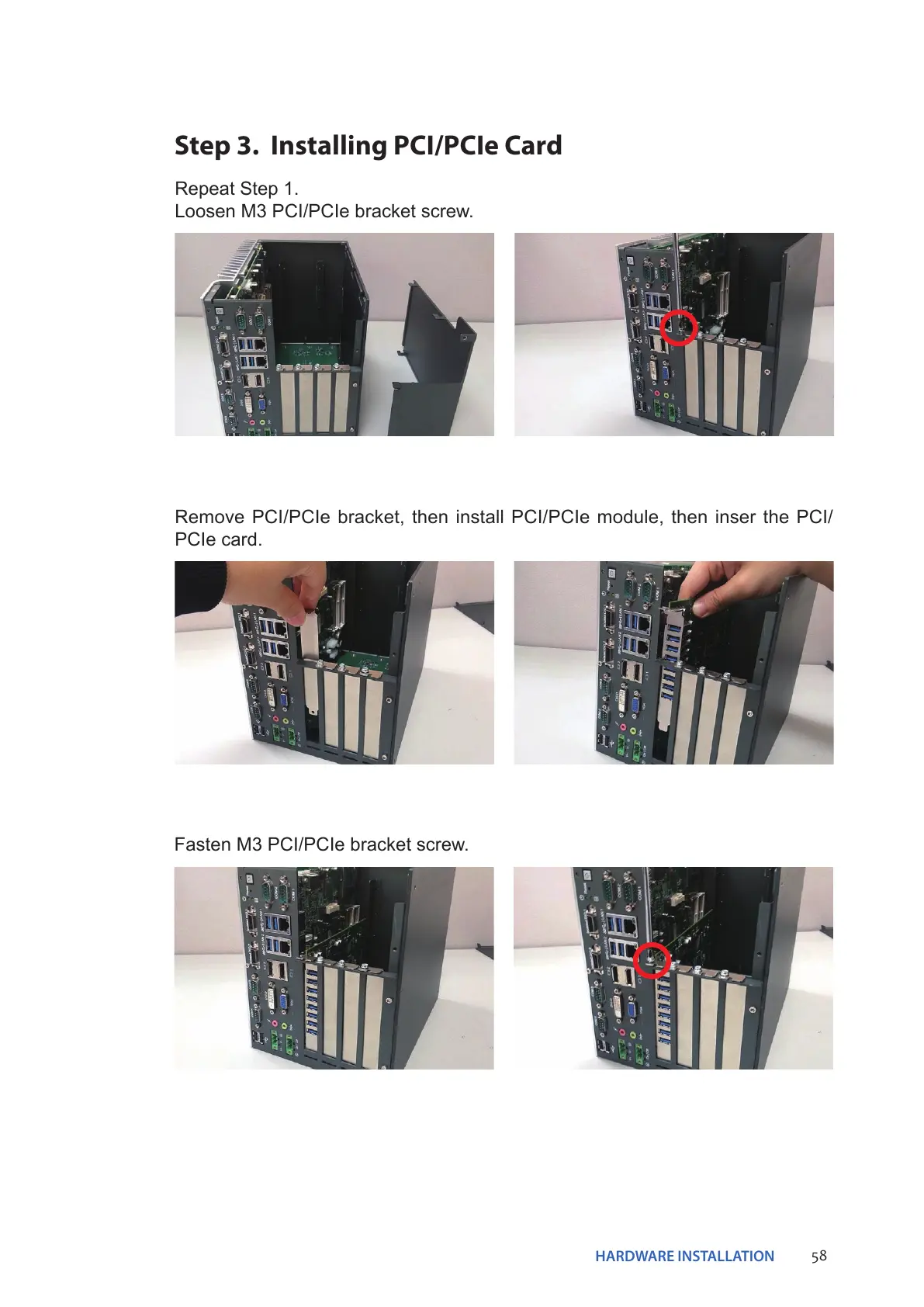 Remove PCI/PCIe bracket, then install PCI/PCIe module, then inser the PCI/