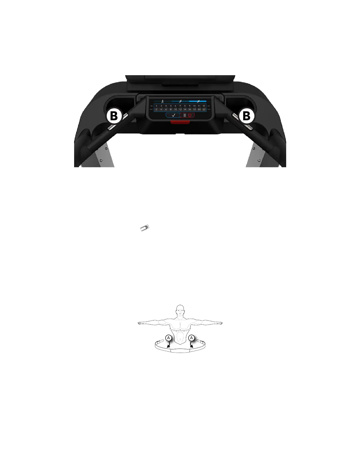 See diagram for correct positioning of the Polar telemetry heart rate chest strap. The electrodes (A), which are the two grooved