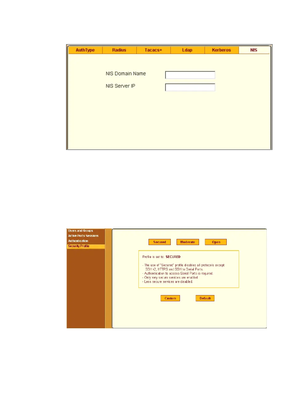 Cyclades AlterPath ACS - Figure 9-12:Expert > Security > Authentication > NIS; Figure 9-13: Expert > Security > Security Profile; Security Profiles