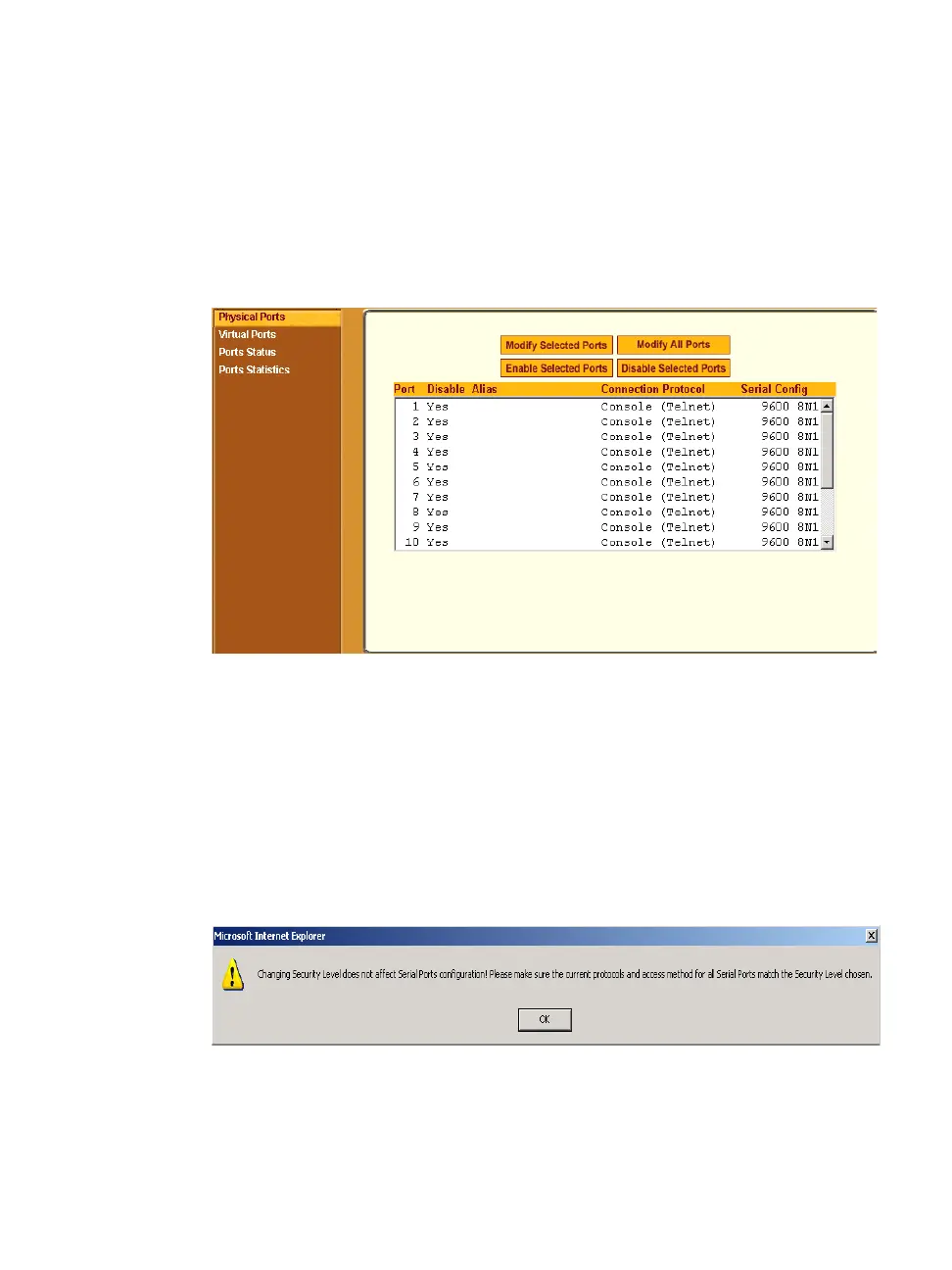 Figure 9-15:Security Profile and Serial Ports Configuration Alert