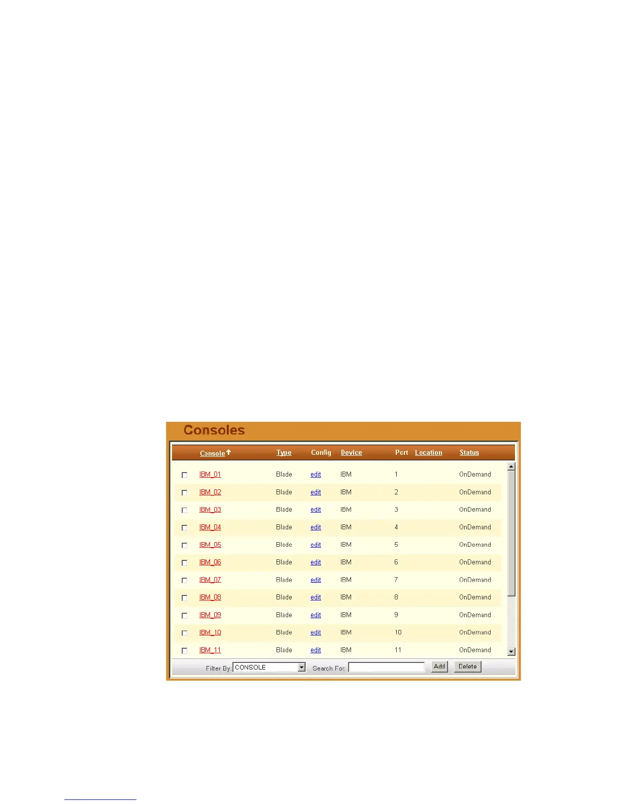The Consoles list form (shown below) displays all the blades and switches