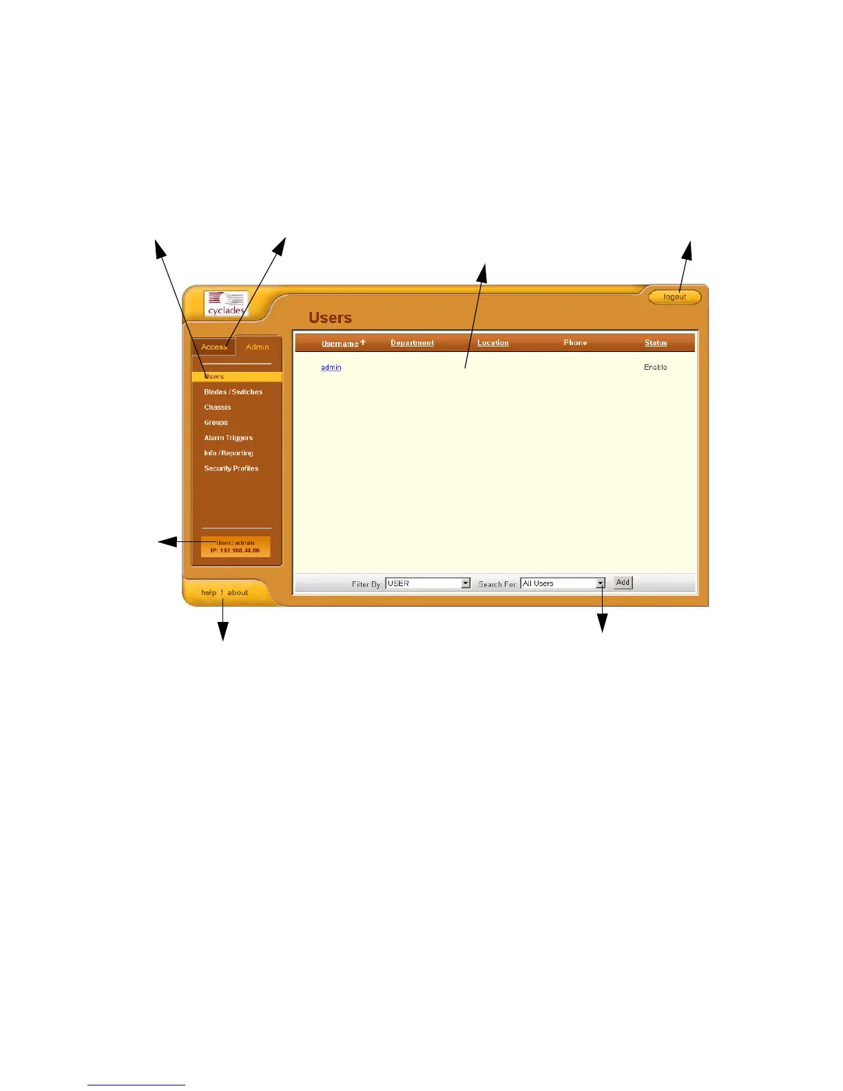 Users List form, the first form to appear in the web interface.