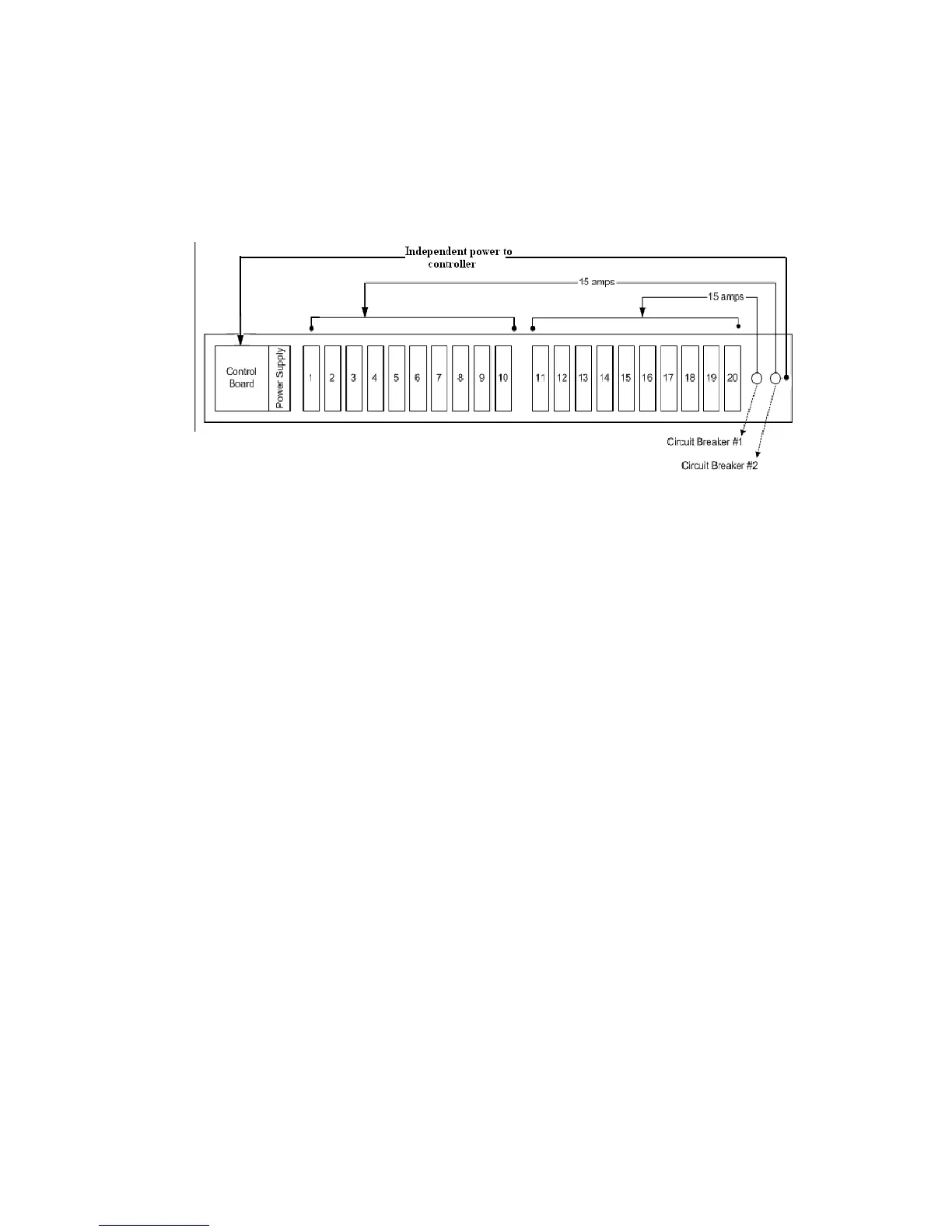 first circuit breaker controls outlets 11 through 20; the second controls outlets