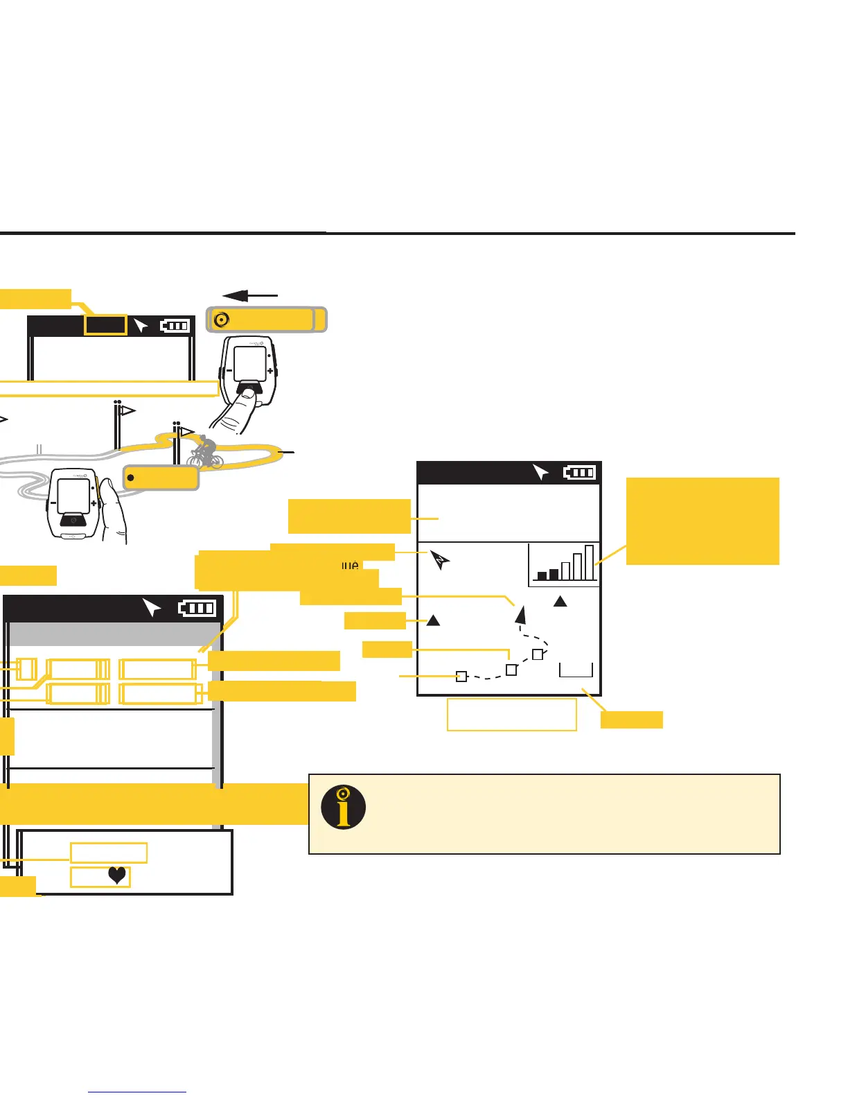 the path ridden to that point in time. The screen may also display waypoints (), interval markers (), and a