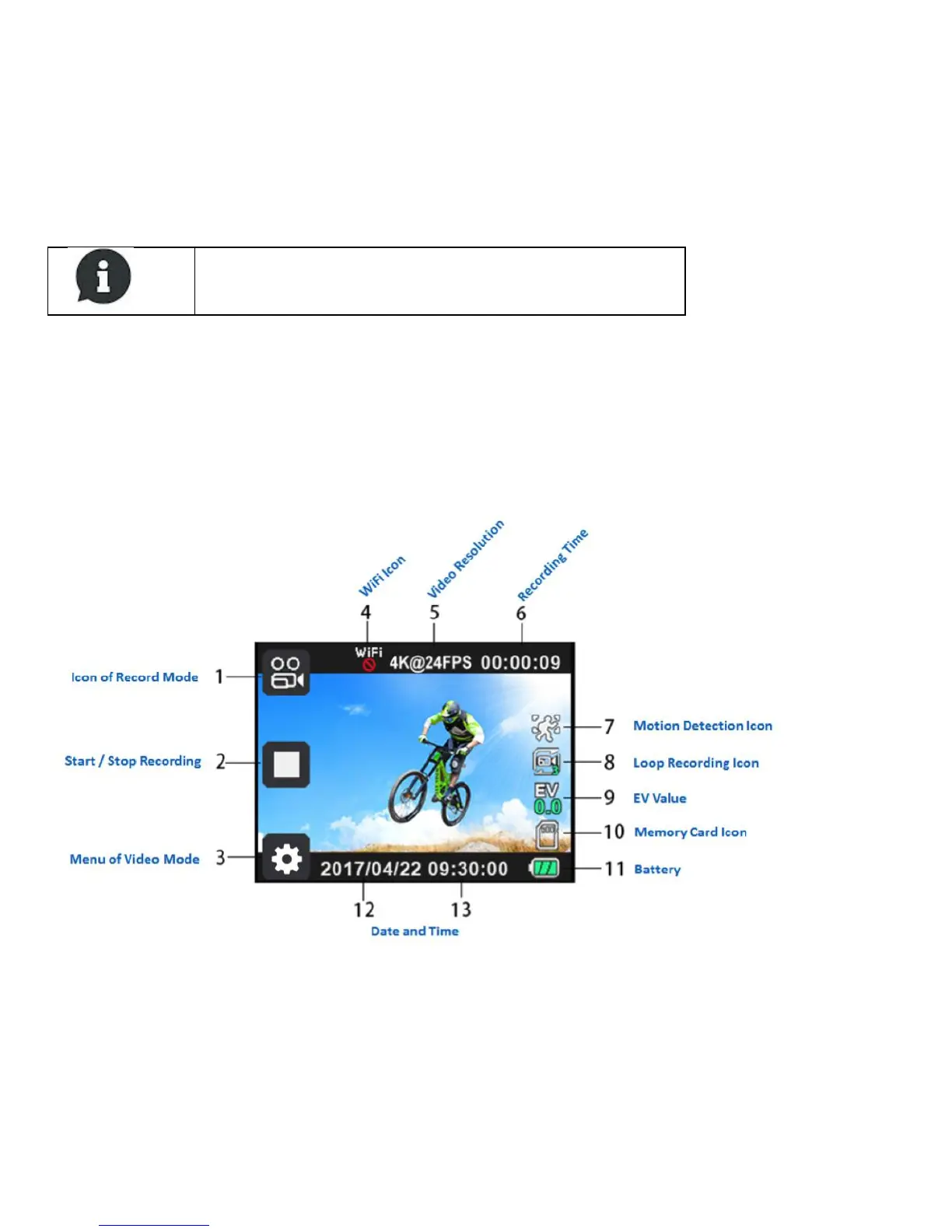 2. Press OK BUTTON. The camera starts recording until card is full.