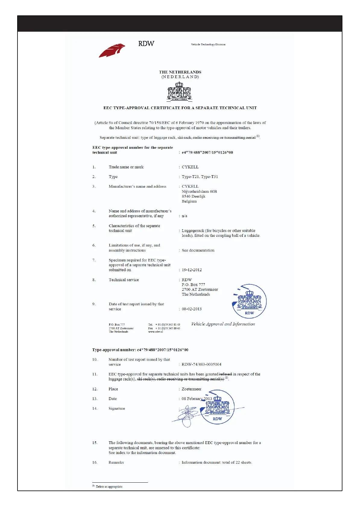 Cykell T21 - Type Approval Certificate; EEC Type-Approval Details
