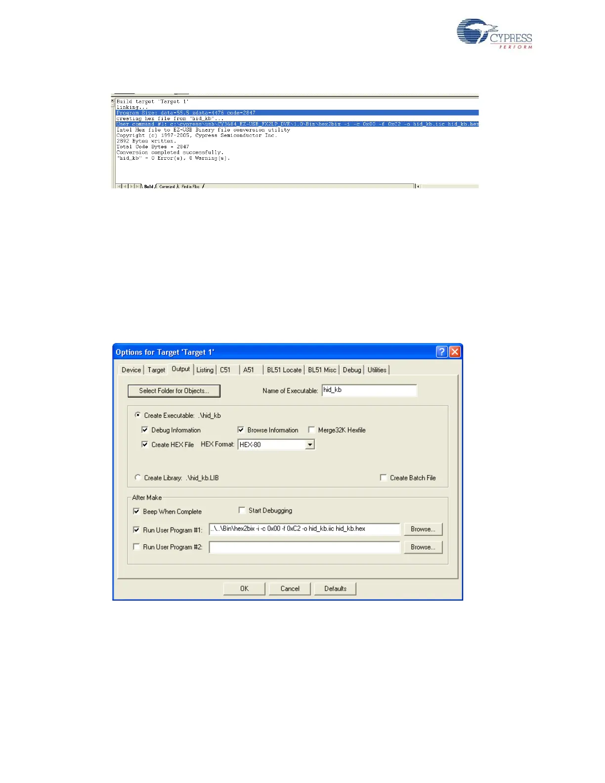 ■ Firmware for EZ-USB RAM memory: The output of the Build Target is hid_kb.hex. It is the rel-