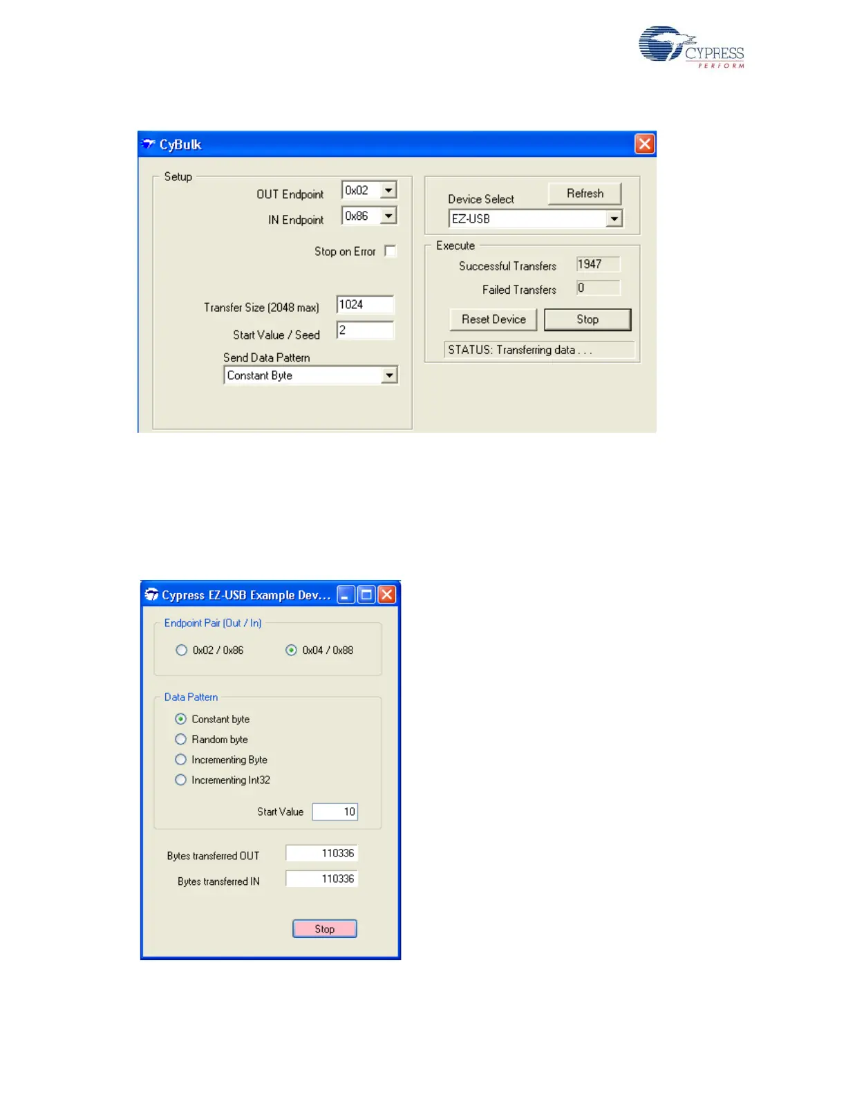Start > All Programs > Cypress > Cypress SuiteUSB 3.4.7 > Bulkloop. Select the Bulkloop OUT