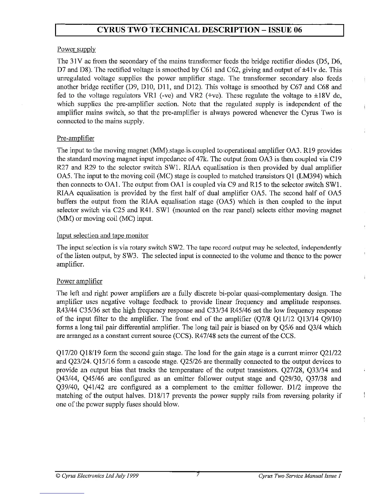 Cyrus Two - Cyrus Two Technical Description - Issue 06; Power Supply; Pre-Amplifier; Power Amplifier